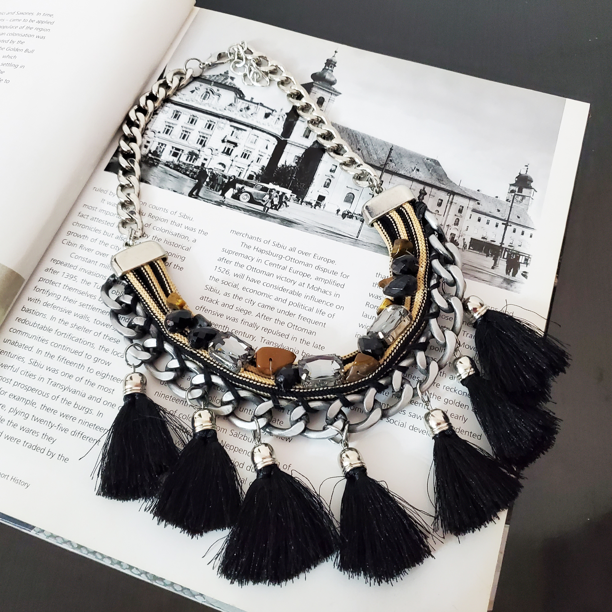 Colier la baza gatului, pe lant metalic solid mare. Colierul este format din trei straturi. Primul este din material textil cu cristale albe si pietre naturale maro, al doilea este lantul metalic argintiu solid, iar al treilea din ciucuri negrii cu fir de matase. Se inchide la spate cu cheita metalica pe lant, reglabila. Se poate asorta atat cu bijuterii din aur cat si cu bijuterii din argint. Produs de serie, realizat in variatii.