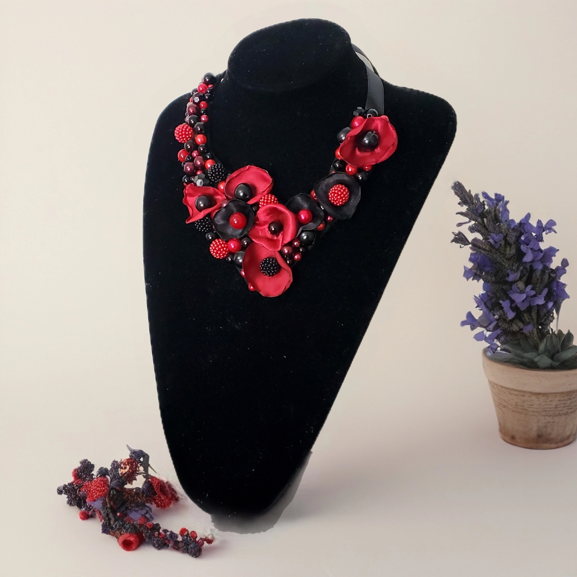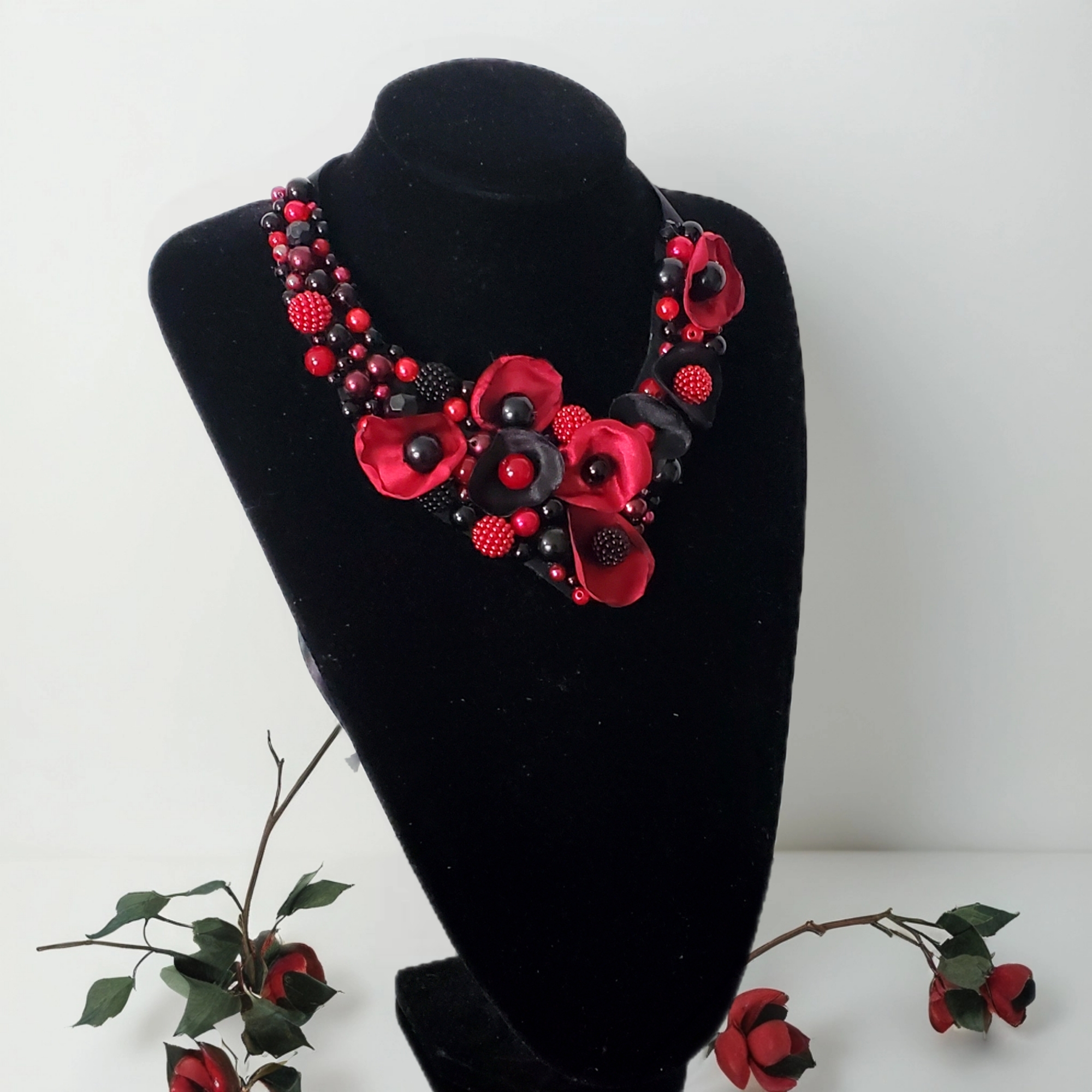 - Perle acrilice negre și roșu închis, de forme și dimensiuni variate, pentru un efect vizual spectaculos