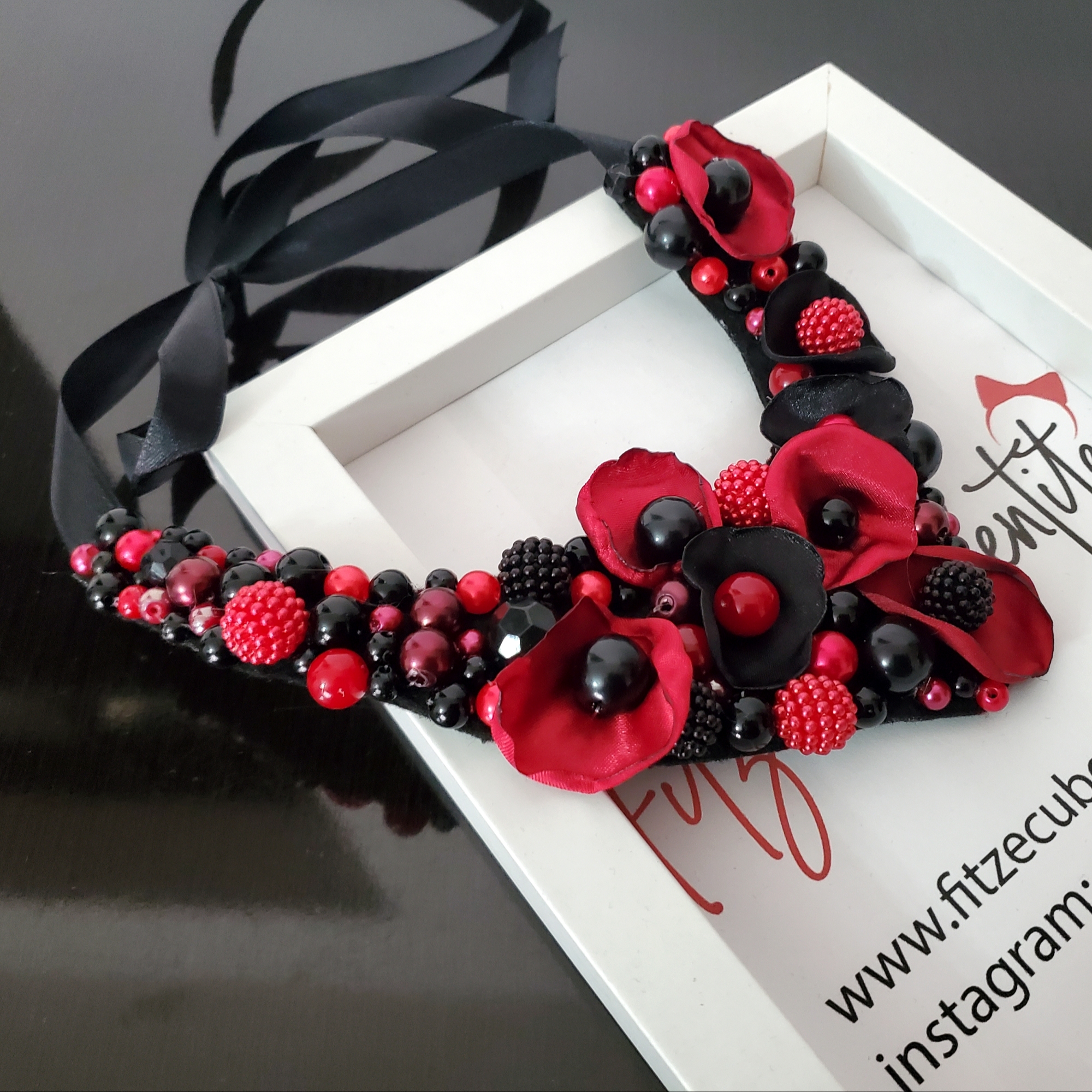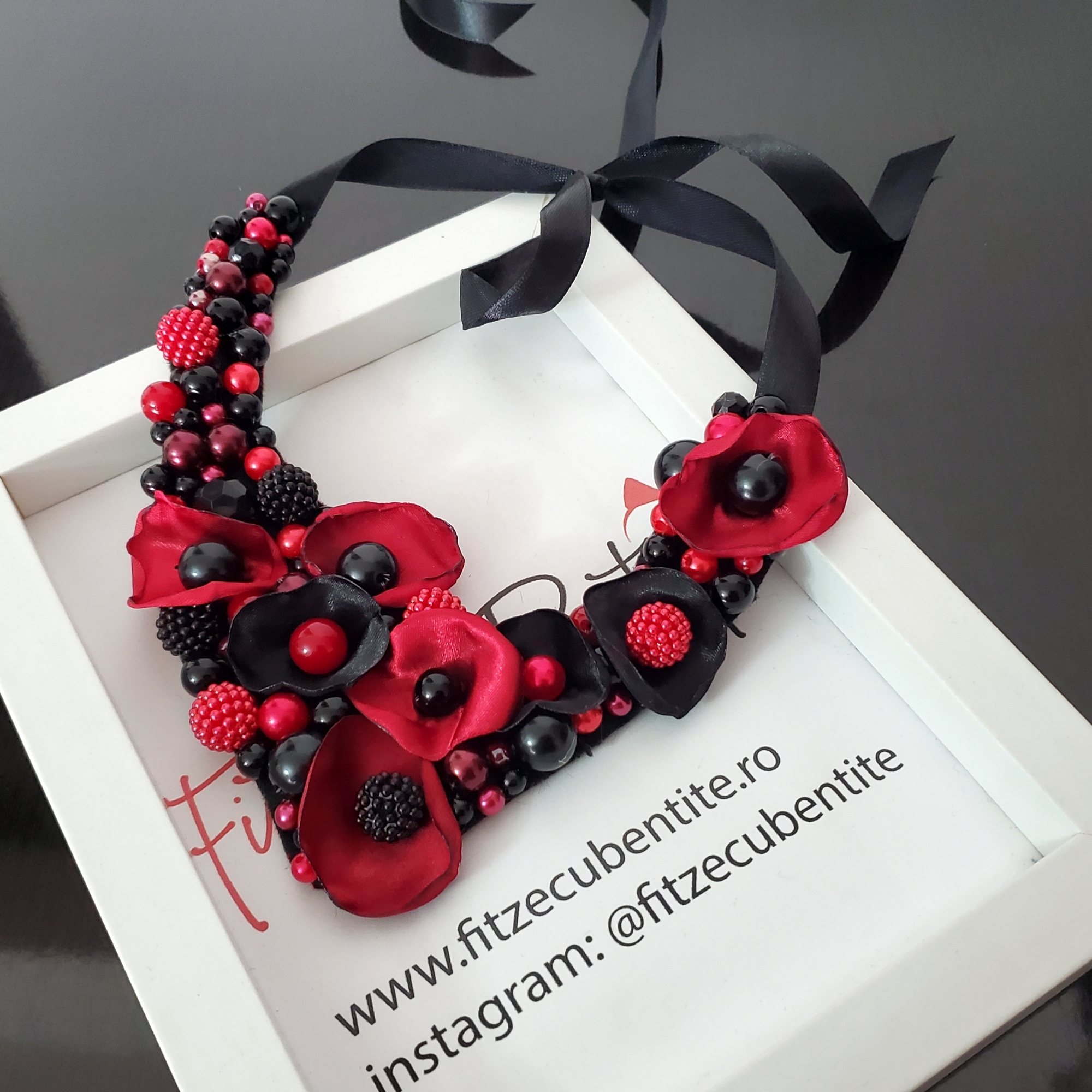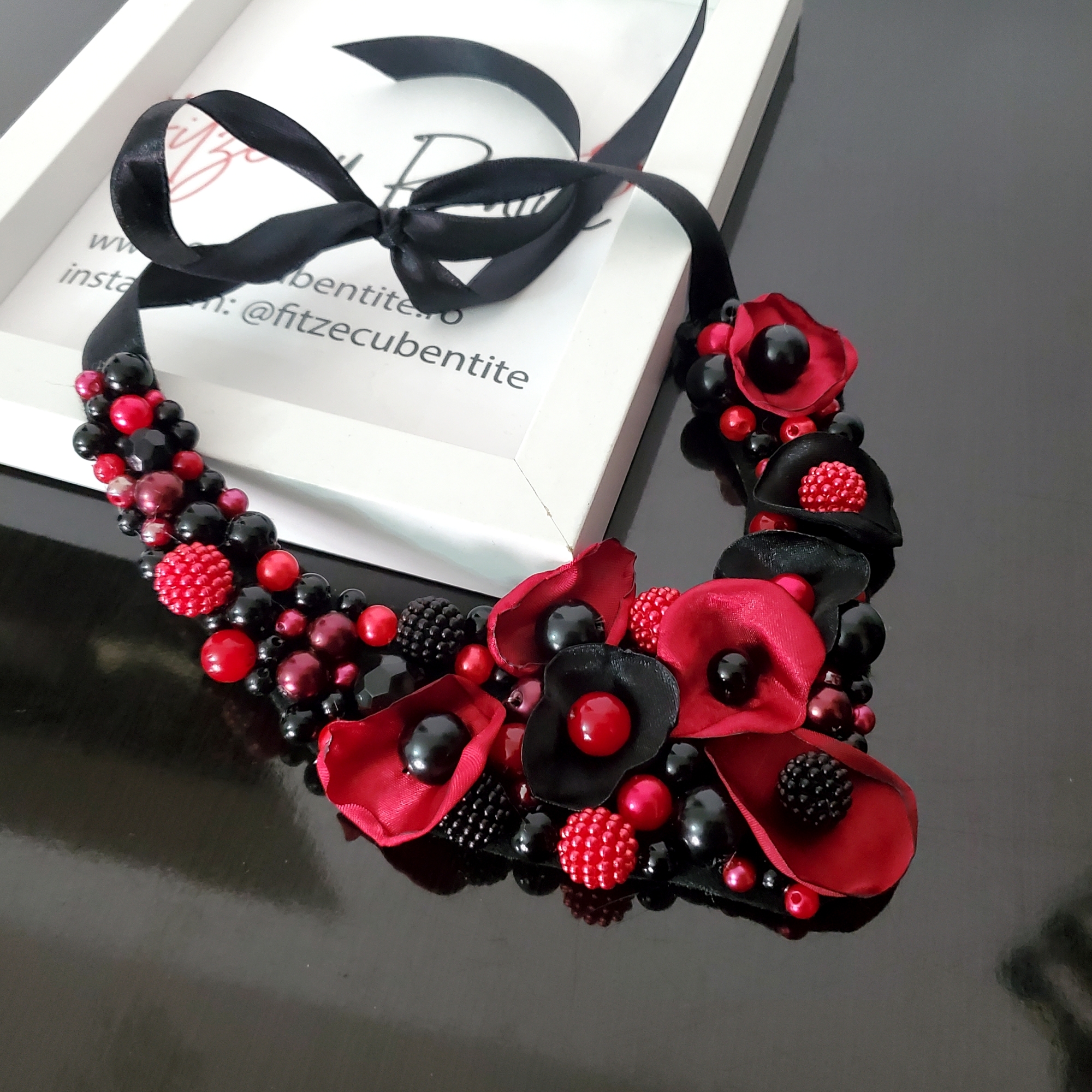 Colierul Statement Rose, lucrat manual, îmbină perle acrilice negre și roșu închis cu petale delicate din satin, creând o poveste rafinată la baza gâtului. Se livreaza in sac textil pentru bijuterii.