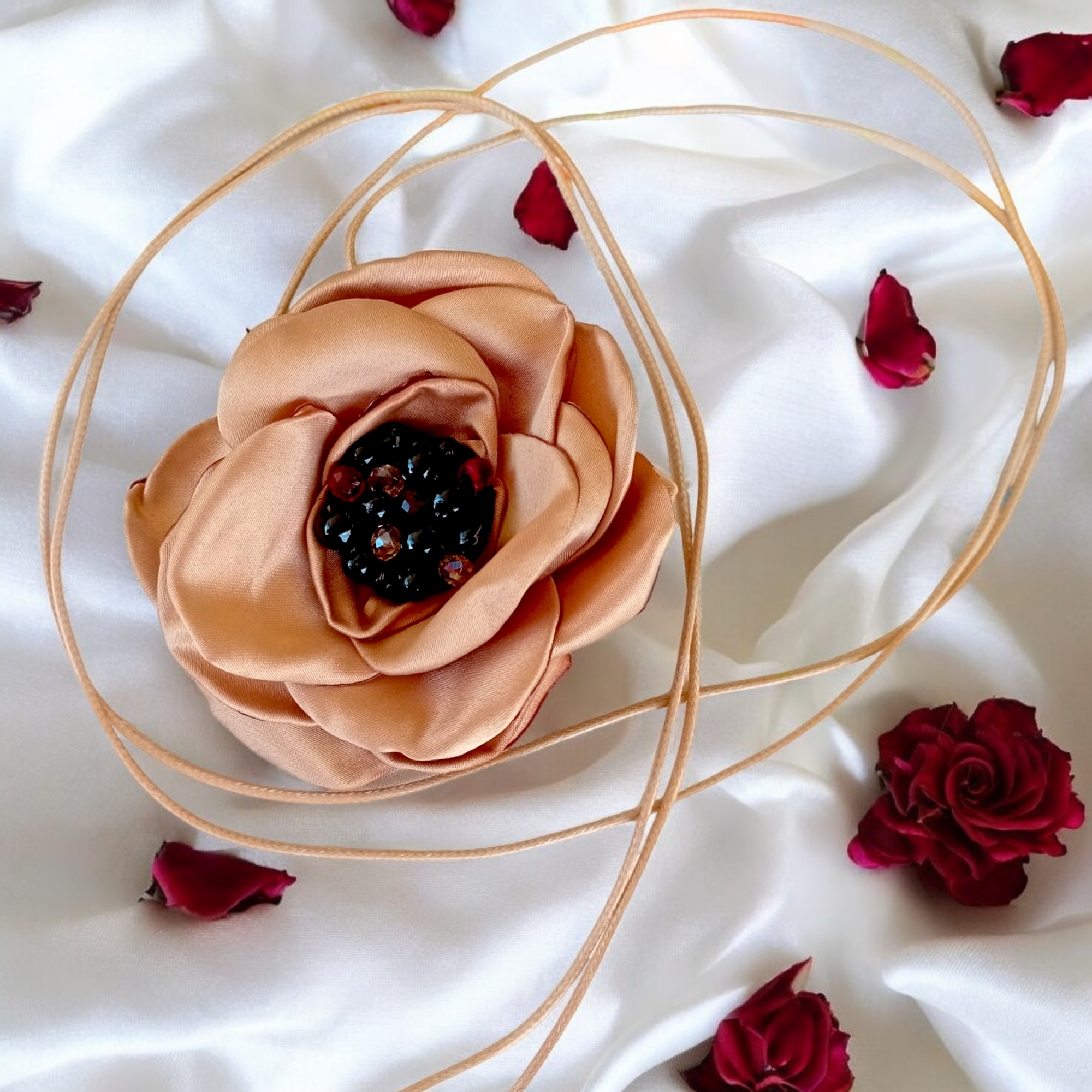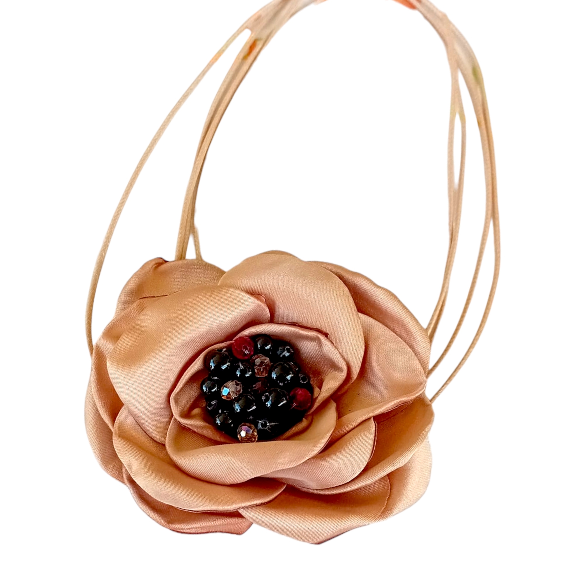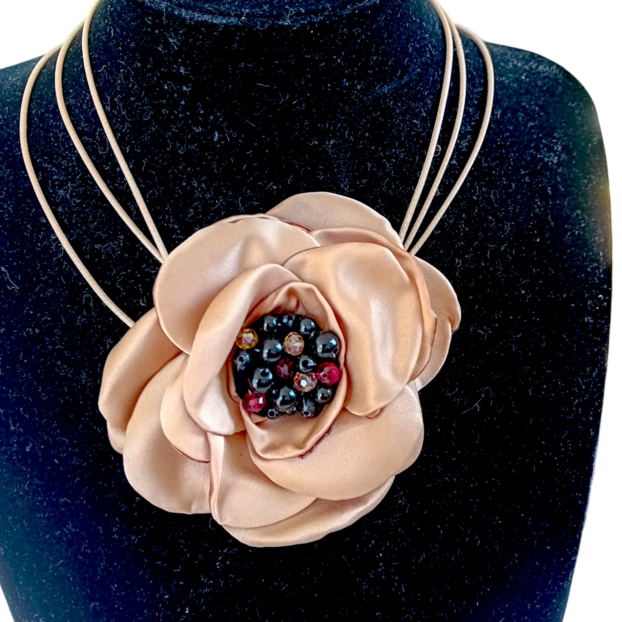 Colier statement pe snur simplu crem. Pe snur este aplicata o floare supradimensionata din satin crem. Petalele sunt arse pe margine, pentru un aspect natural. Pe floare sunt cusute perle negre, crem, maronii. Colierul se poate lega de doua ori si se poate purta tip choker, sau se poate lega o singura data pentru a putea fi purtat la baza gatului.