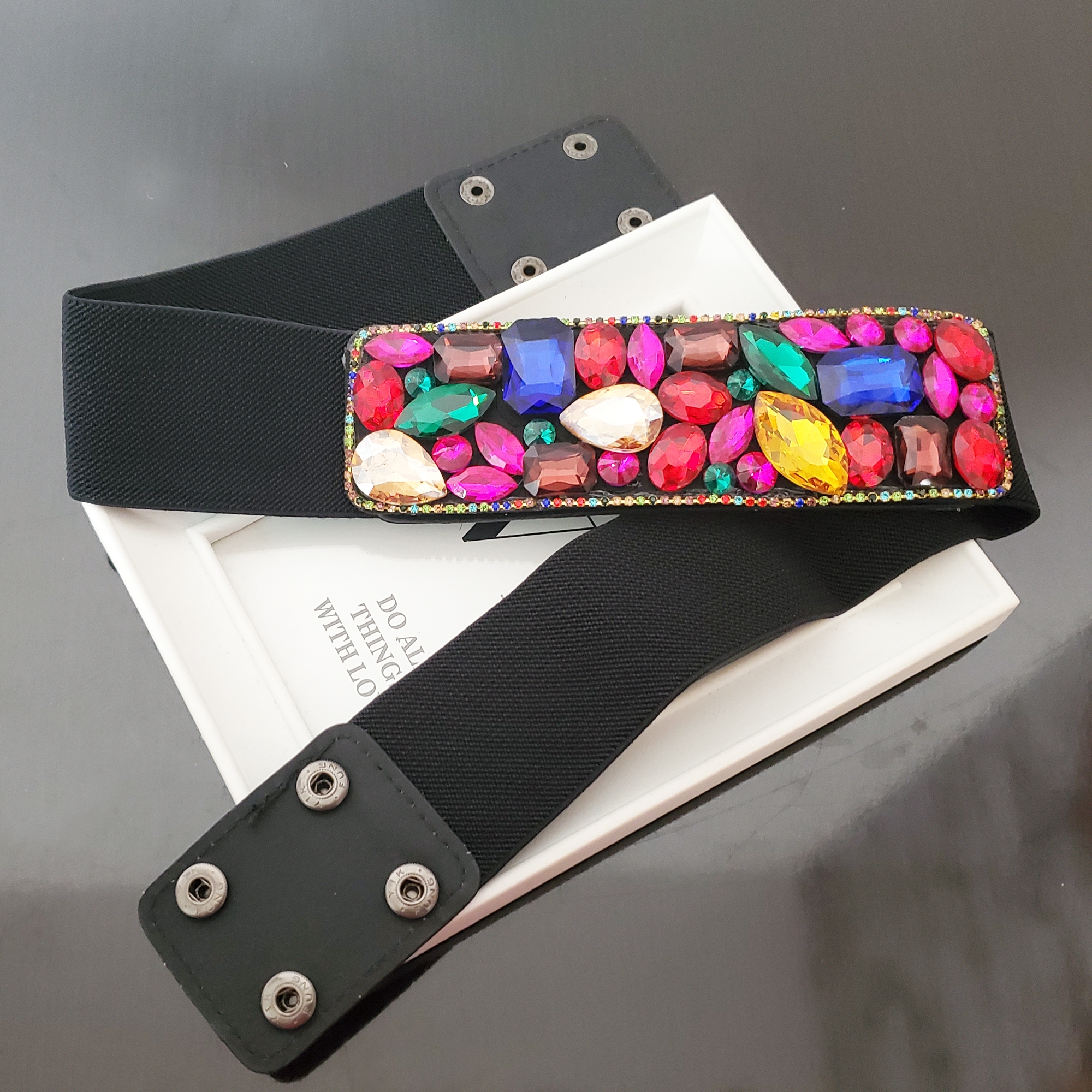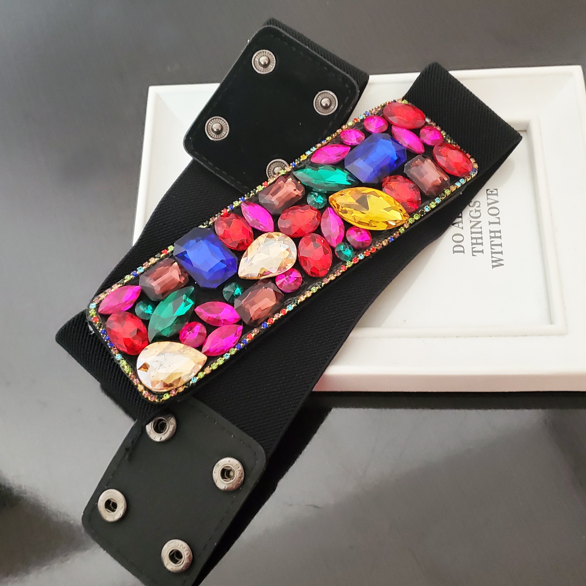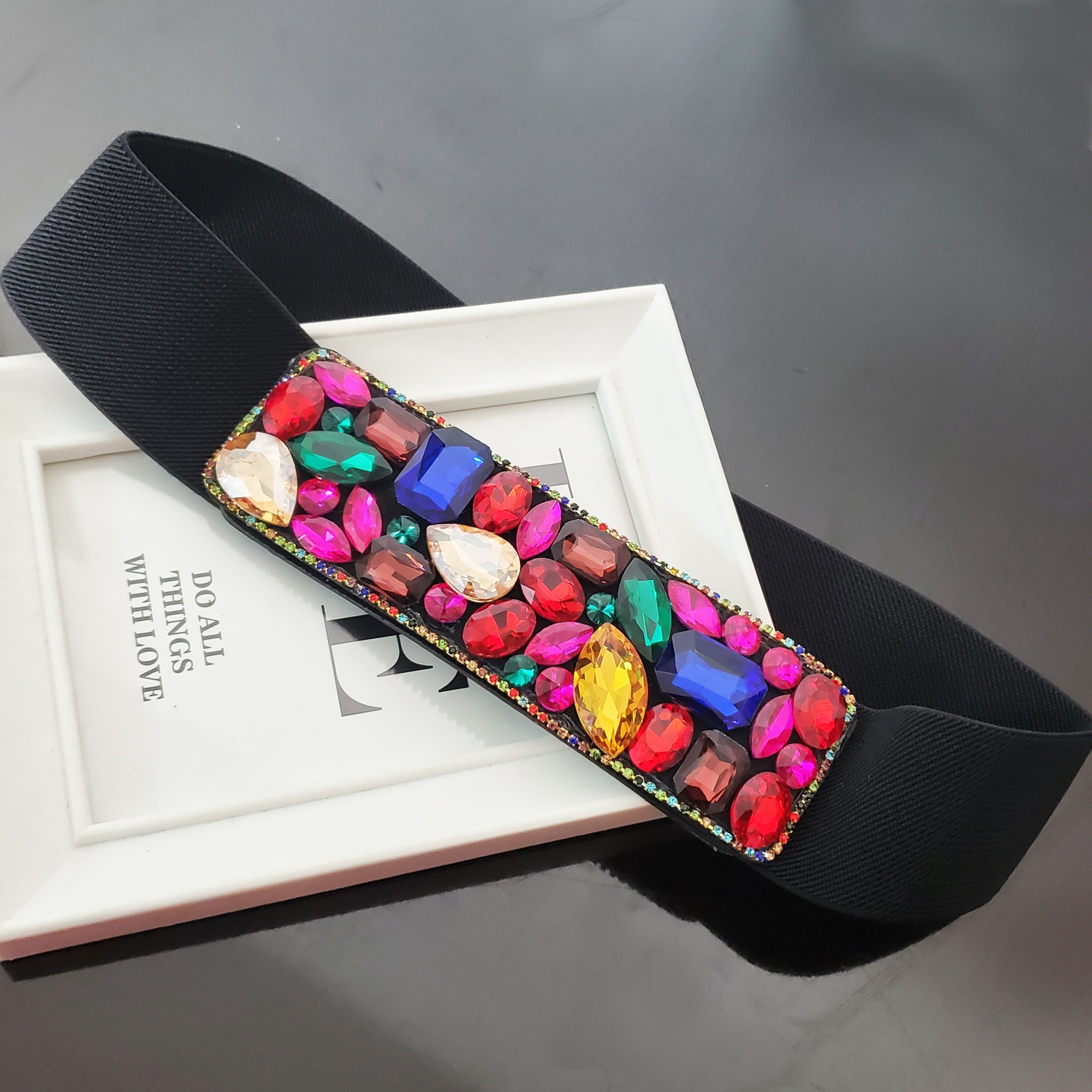 Curea eleganta cu cristale de sticla multicolore, pentru o tinuta simpla ce are nevoie de un accesoriu statement.