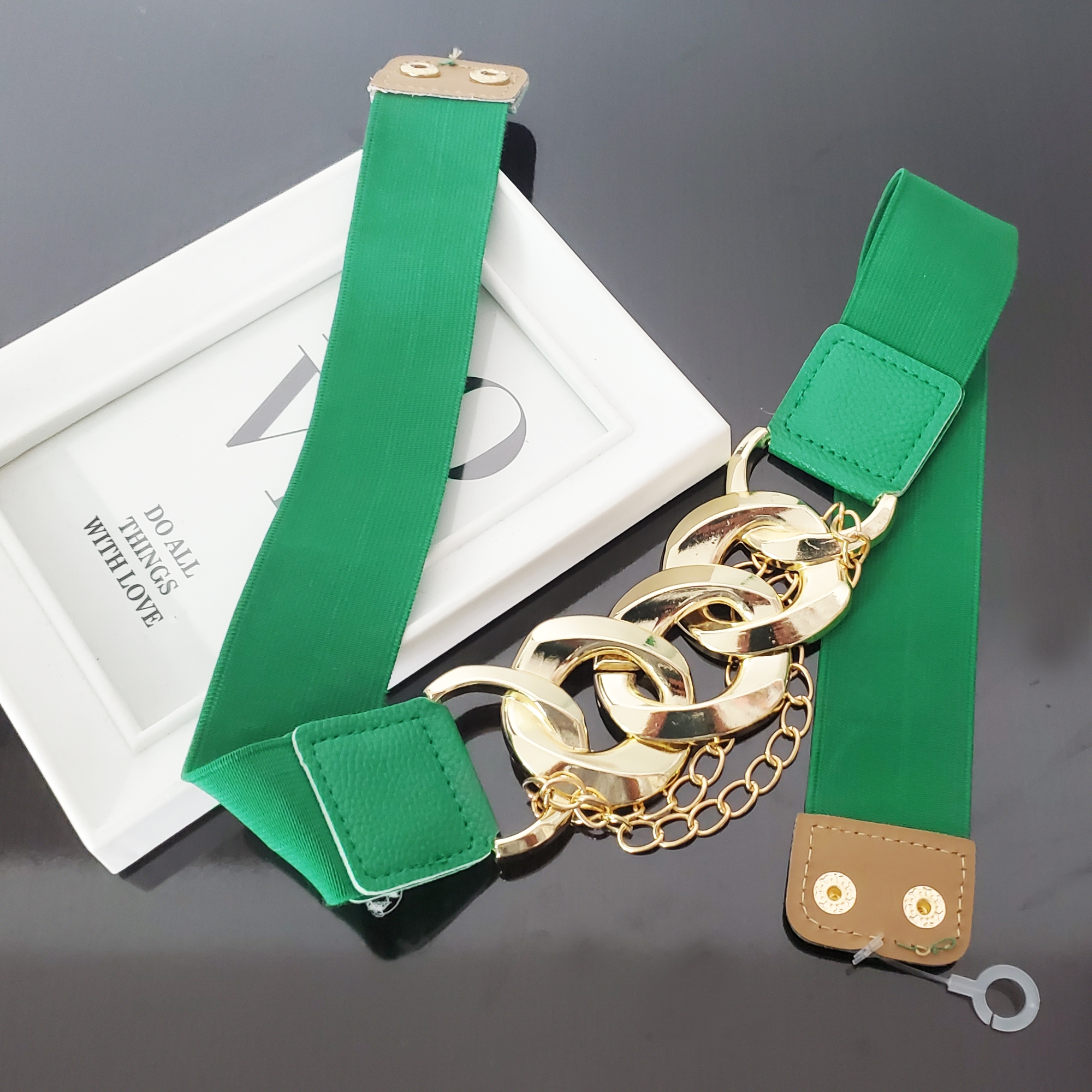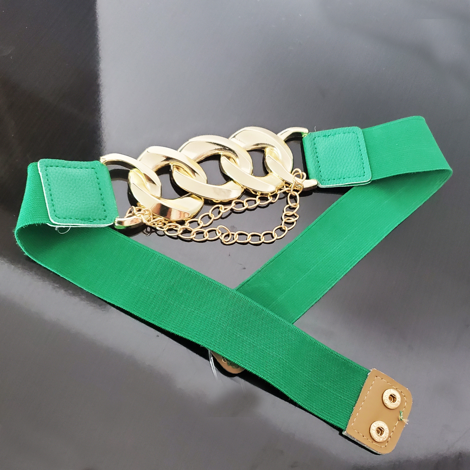 Cureaua Chicago este confectionata pe banda elastica verde. Inchiderea se face la spate, cu capse. Elasticul este lejer, nu strange tare, cureaua fiind potrivita pentru orice silueta. Partea din fata este formata din 3 lanturi, unul supradimensionat si 2 mai subtiri