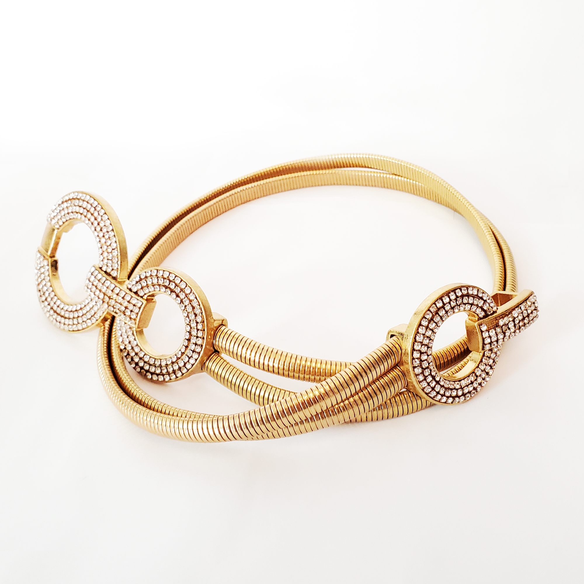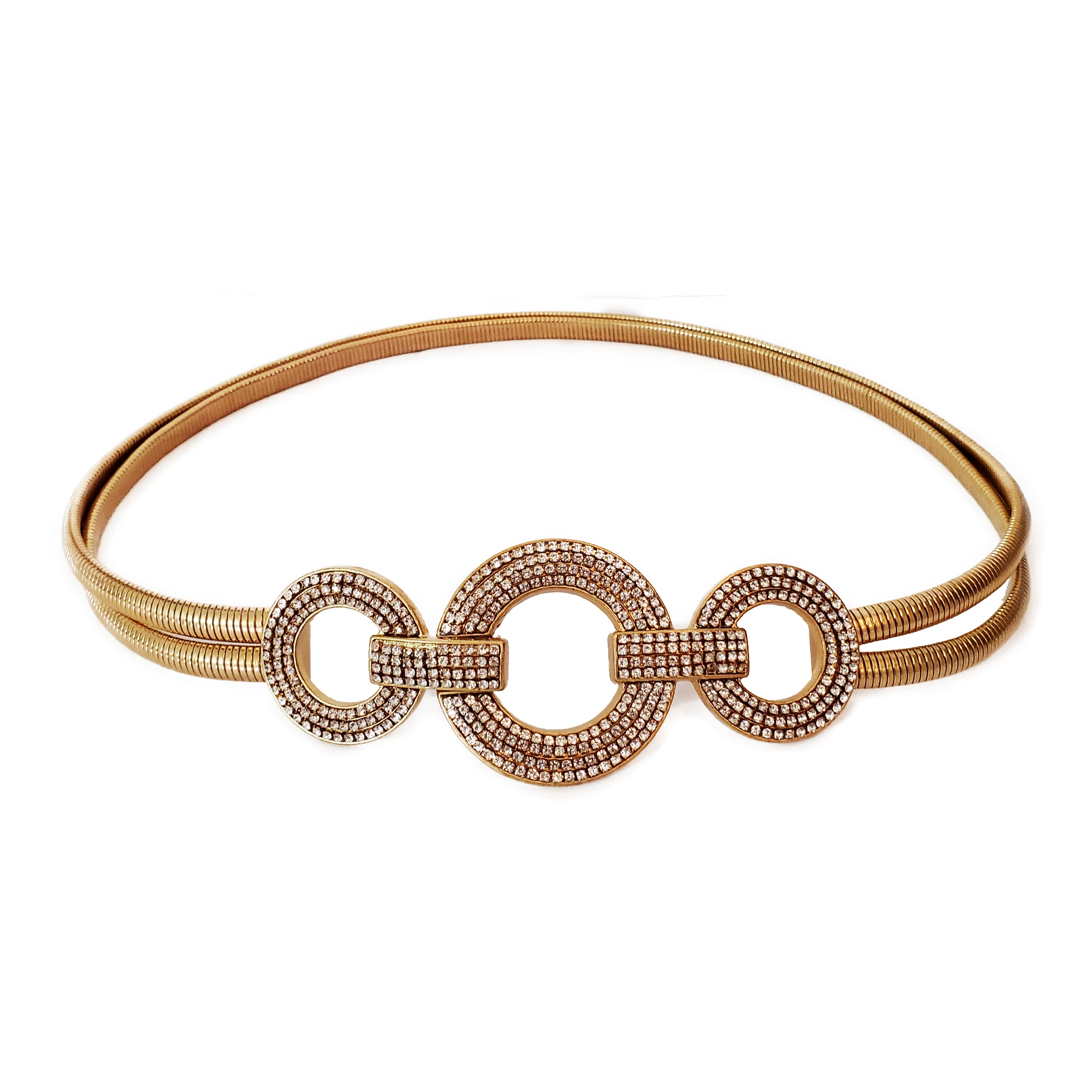 Cureaua este confectionata din doua parti metalice modelatoare, elastice. Catarama este metalica aurie cu strasuri albe batute. Se inchide in fata cu ajutorul cataramei elegante.
