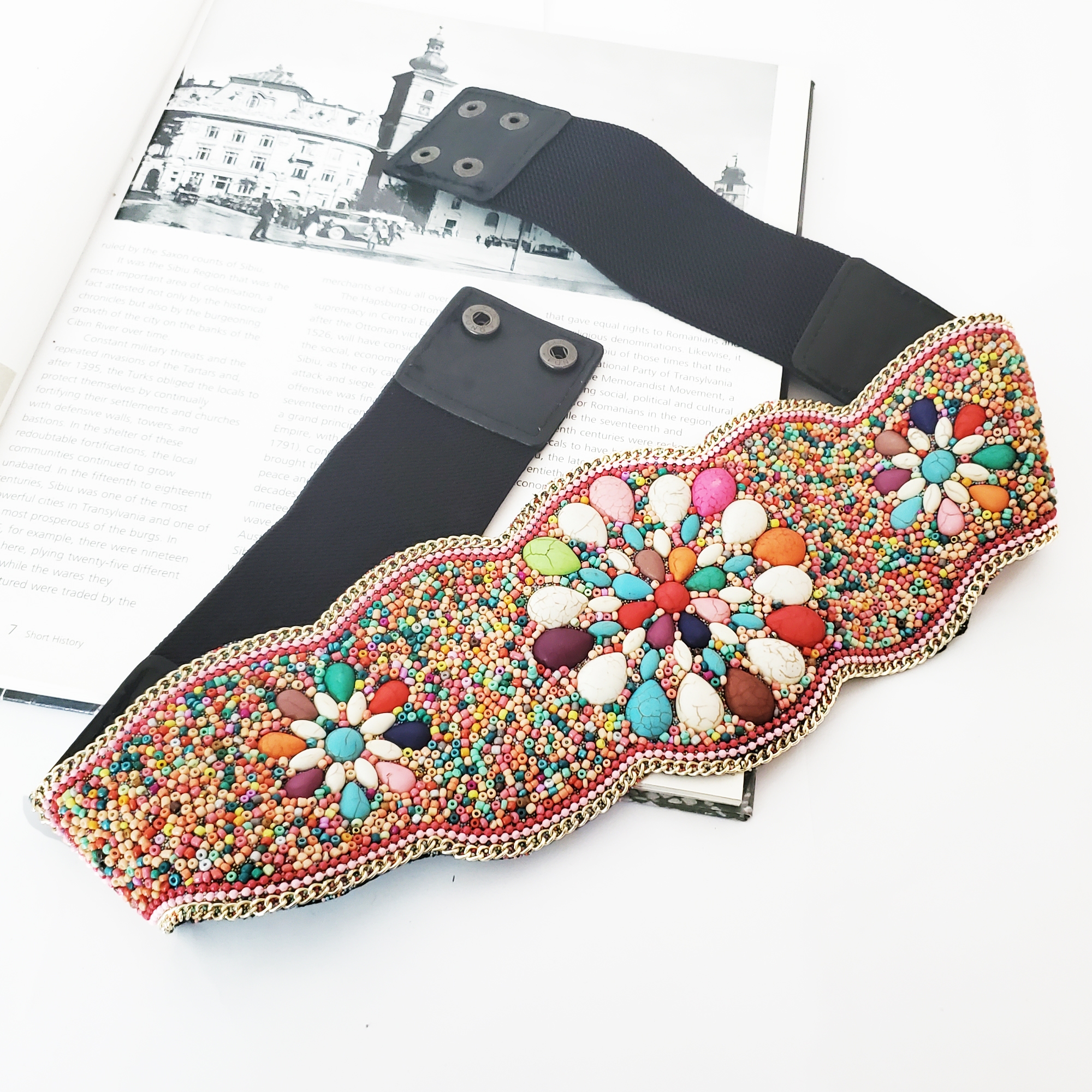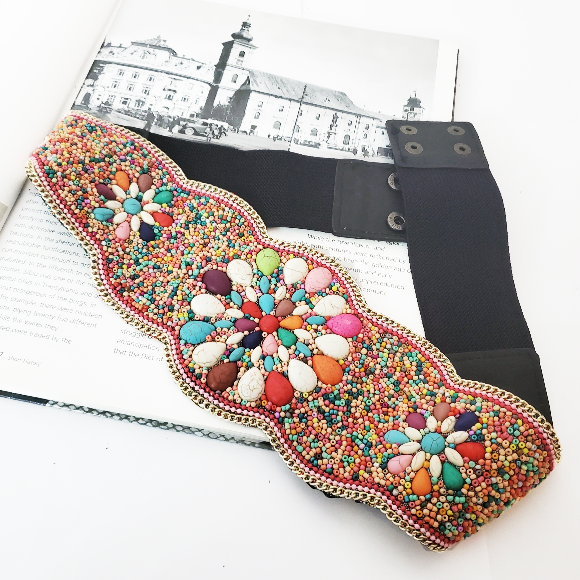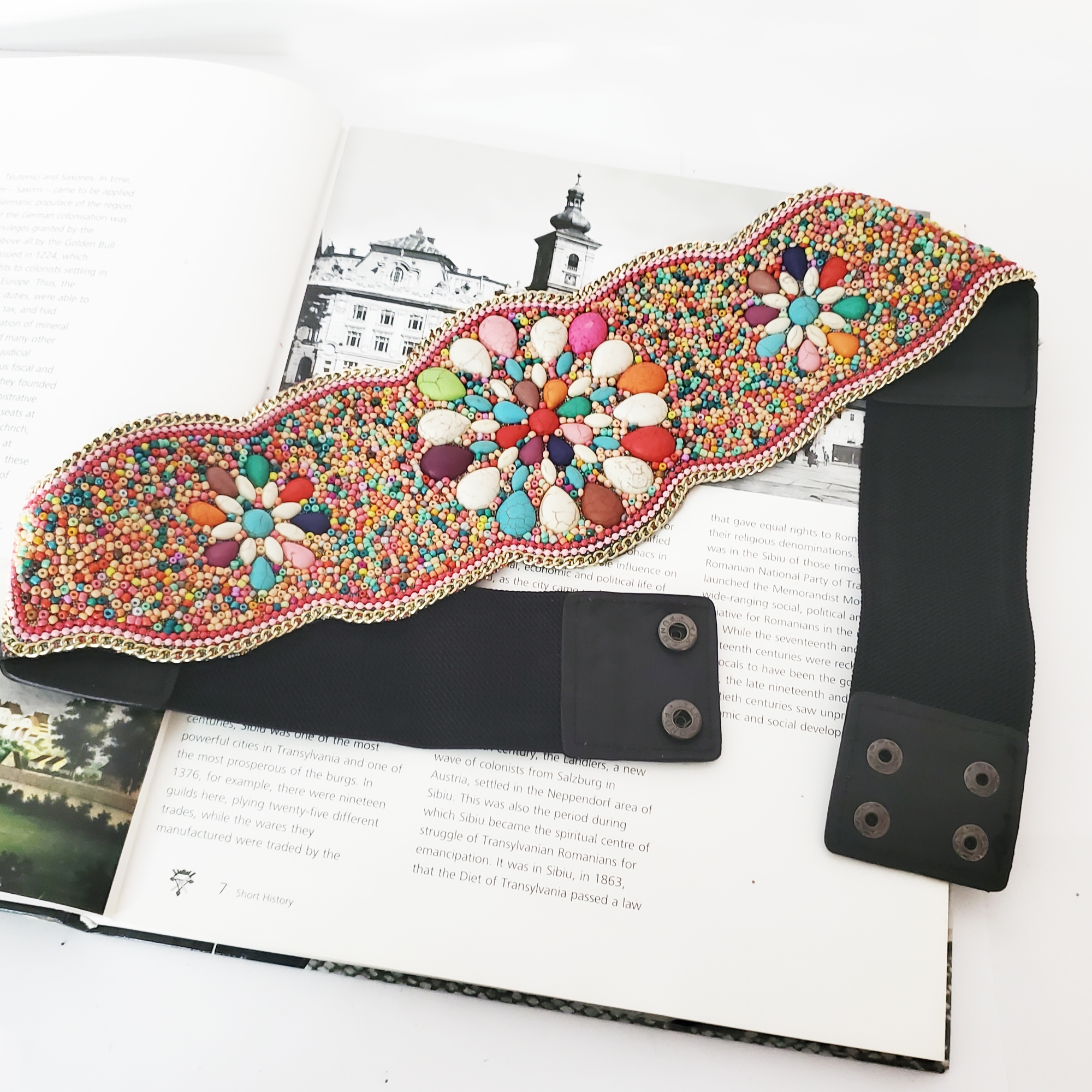 Centura etno este confectionata pe banda elastica cu intaritura in partea din fata. Inchiderea este cu capse. Exista 2 randuri de capse, pentru a putea fi ajustata dupa talie si confort. Toate aplicatiile din fata sunt aplicate prin presa calda pentru a ramane in material. Acestea sunt margelute de nisip de diferite nuante si dimensiuni, pietre acrilice, si lant auriu pe ambele margini. Fiind aplicate la cald in material, nu se agata de geanta, camasa sau diferite bijuterii.