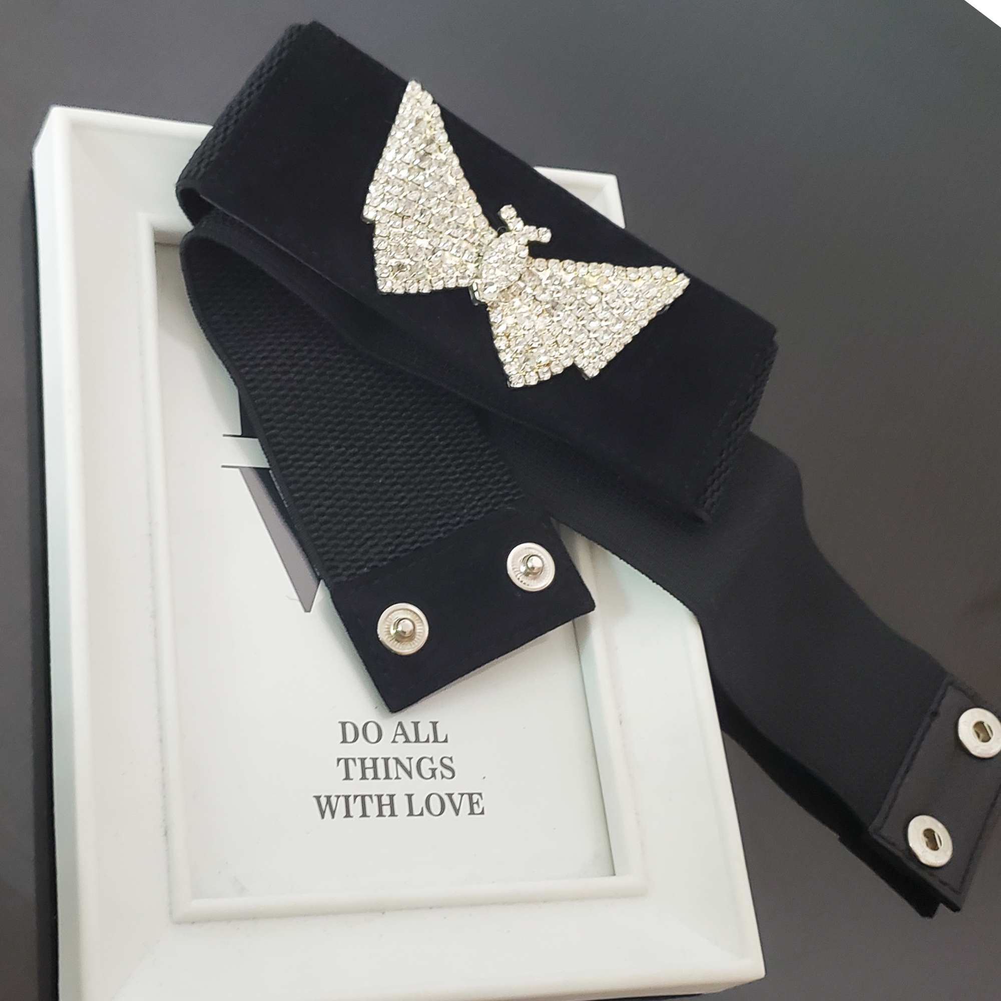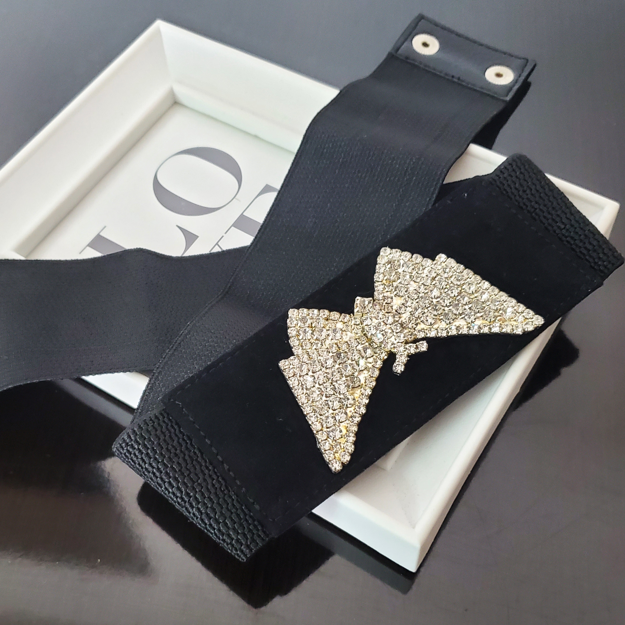 Cureaua Farfalle este confectionata pe banda elastica lejera neagra, cu intaritura din piele naturala in partea din fata. Pe intaritura este o aplicatie din strasuri de sticla in forma de fluture.