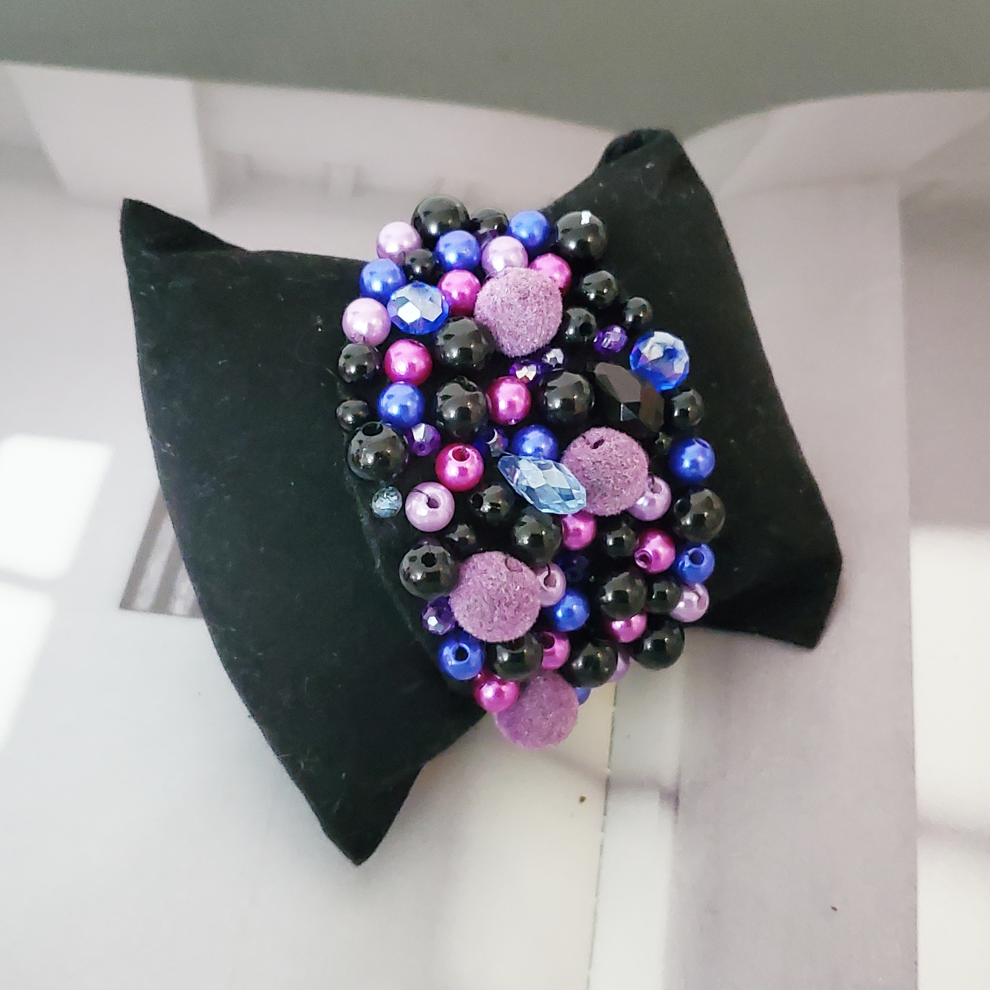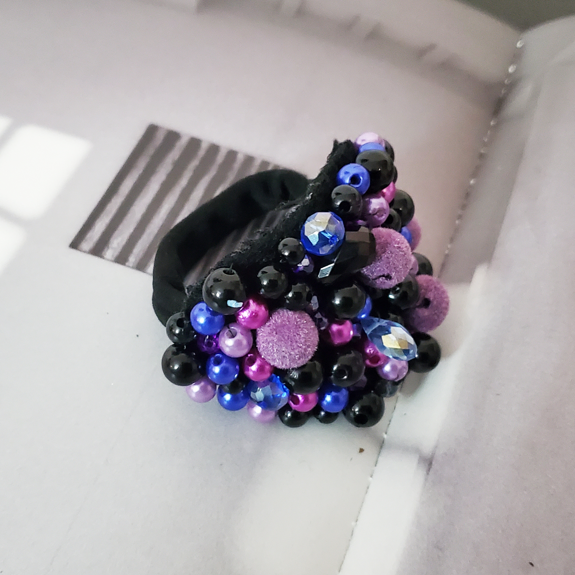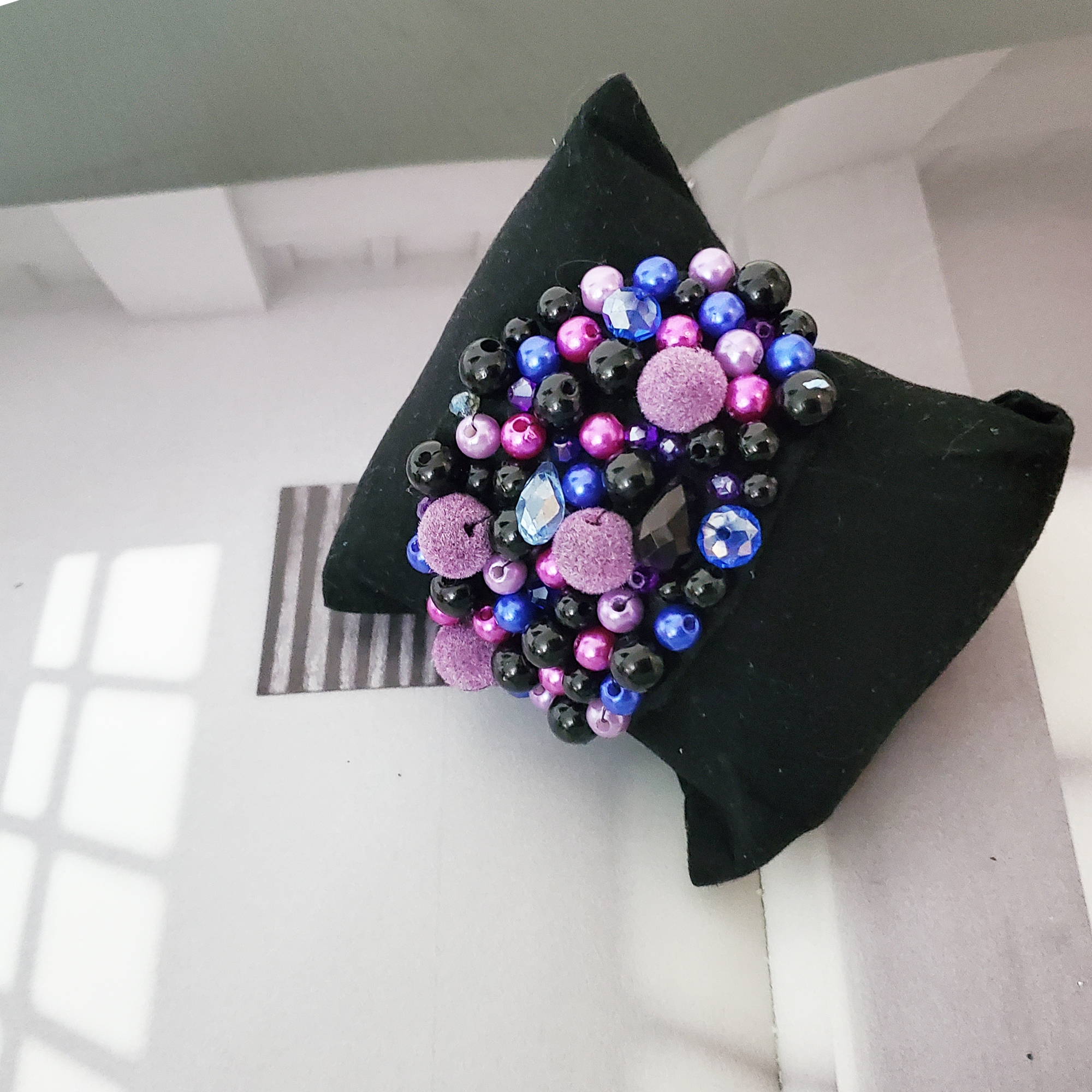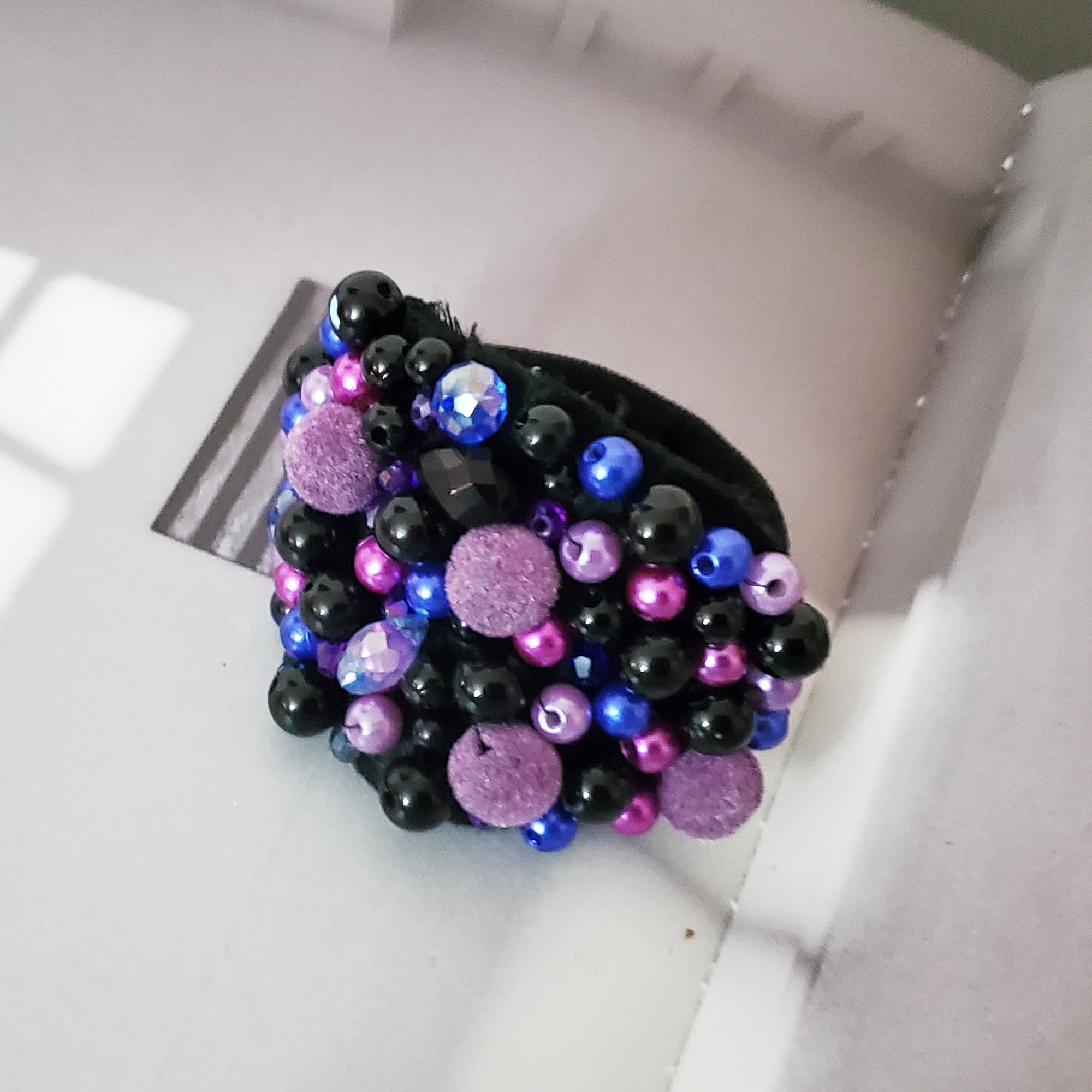 Aplicatia este cusuta pe elastic subtire buretos confectionata din perle si cristale de sticla in nuante de albastru, mov si negru