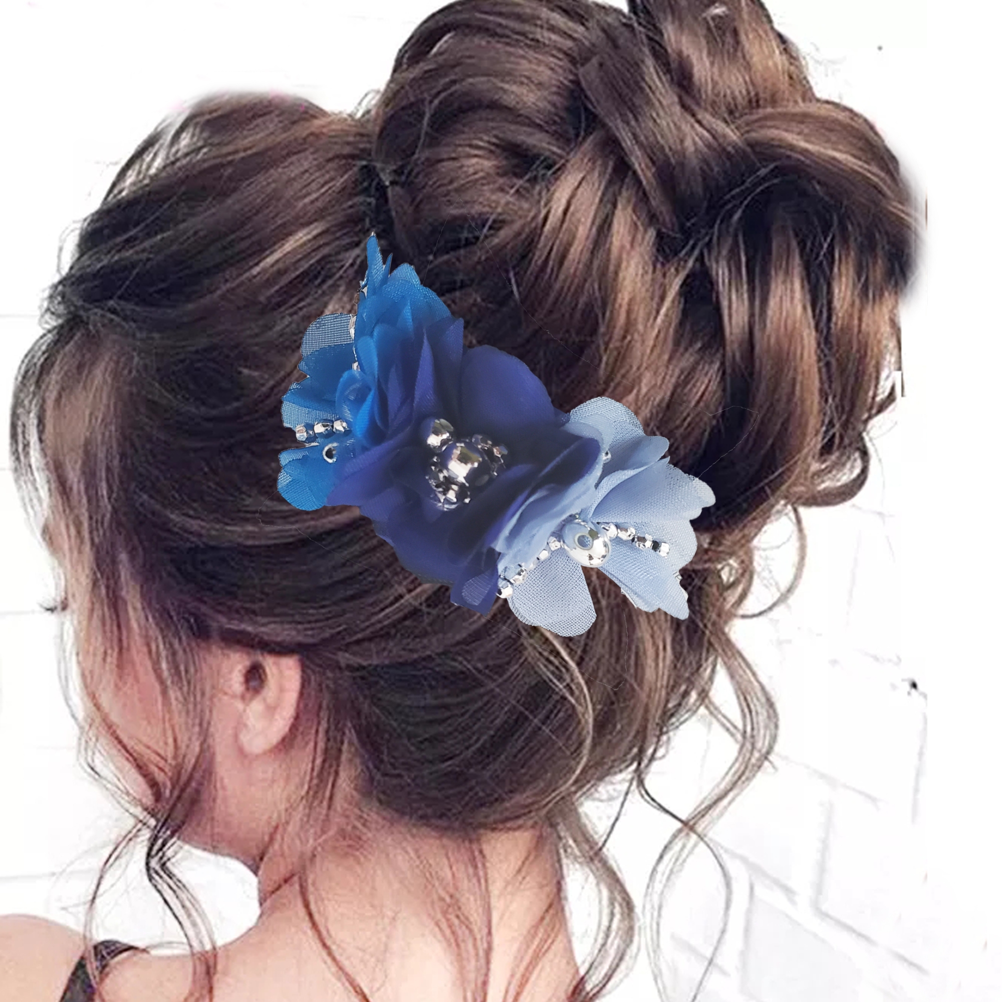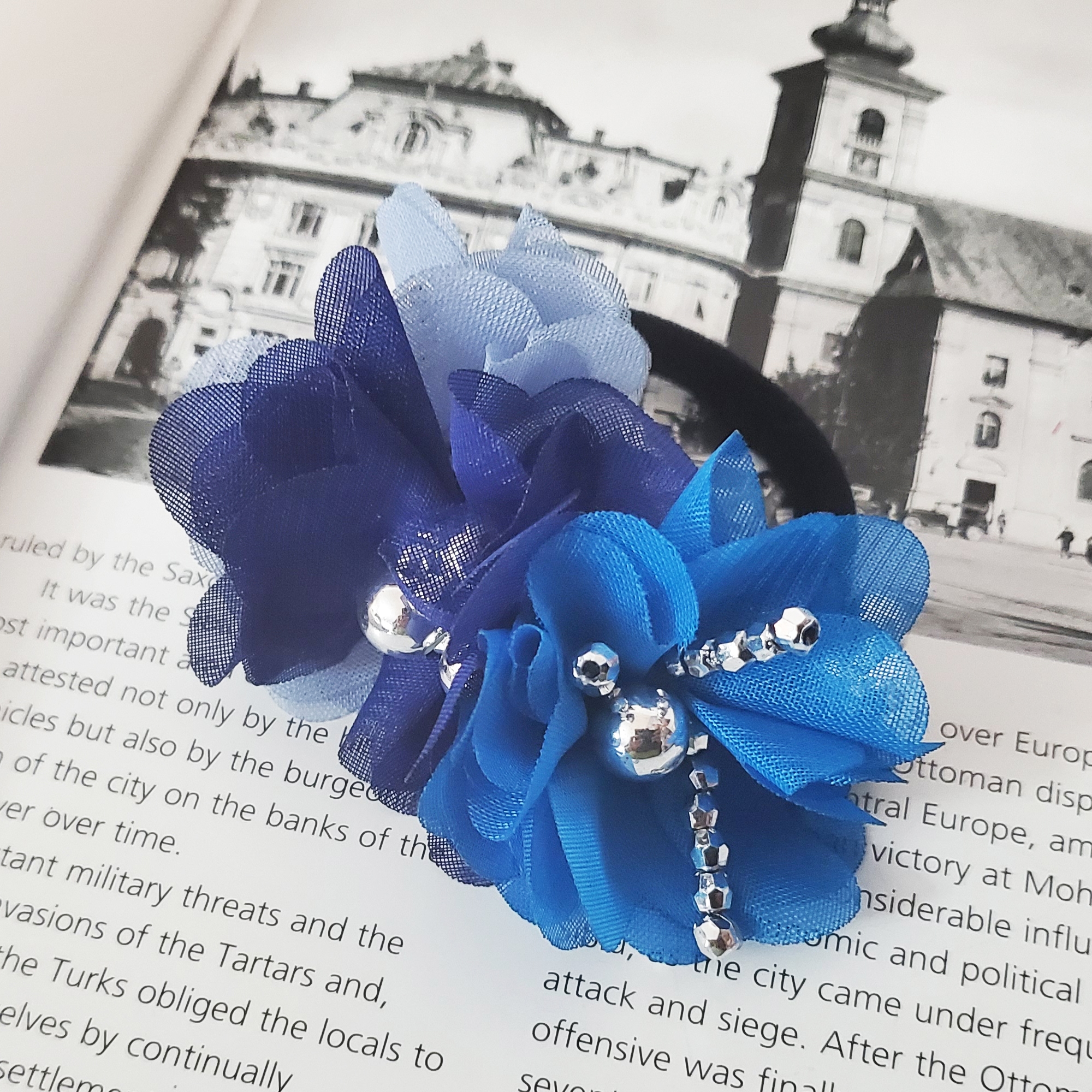 Accesoriul este confectionat din 3 flori din tule in nuante de albastru cusute pe elastic negru subtire buretos. Florile sunt cusute pe elastic impreuna cu perle argintii
