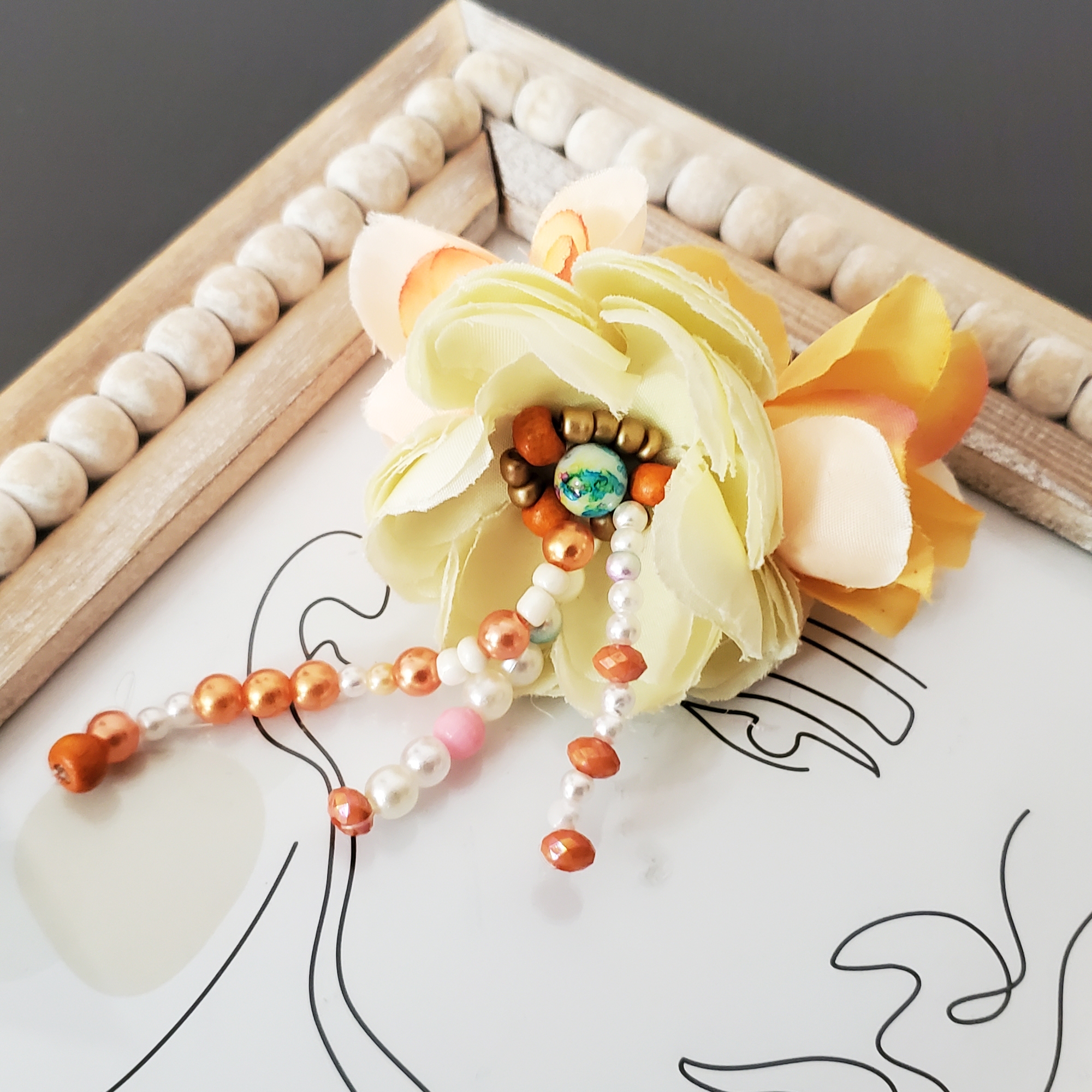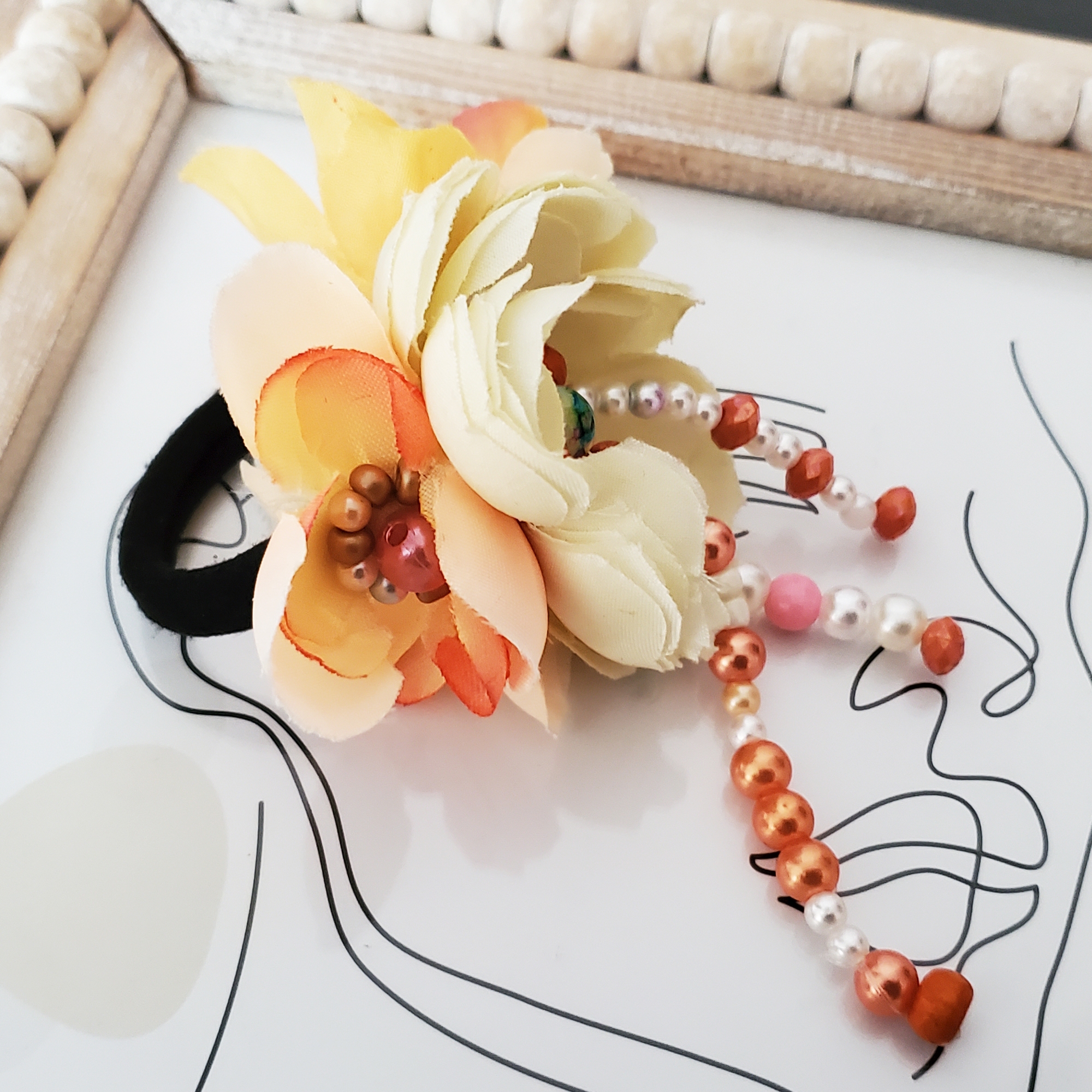 Elastic de par cu flori in culori calde si perle. Produs handmade.