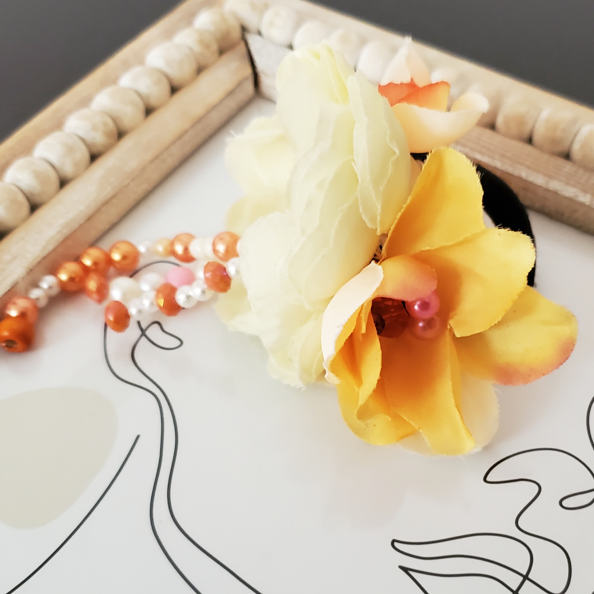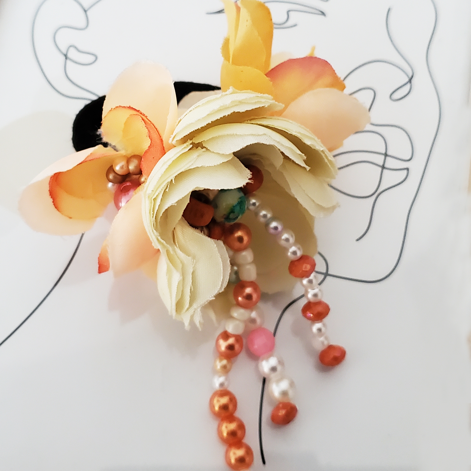 Elastic de par cu 3 flori in nuante de crem, portocaliu, vanilie, si perle asortate.