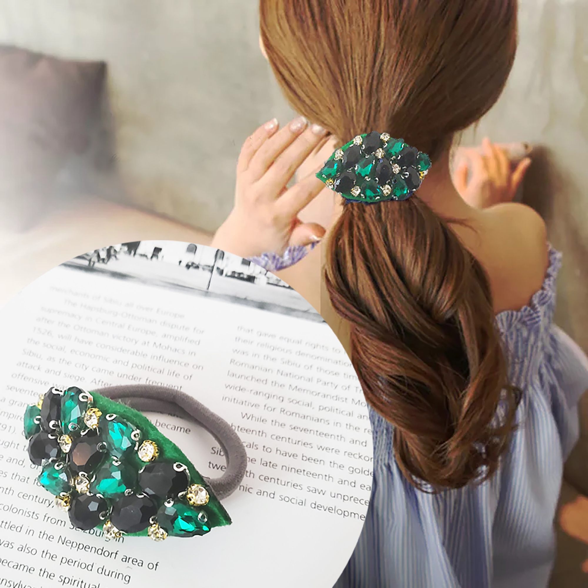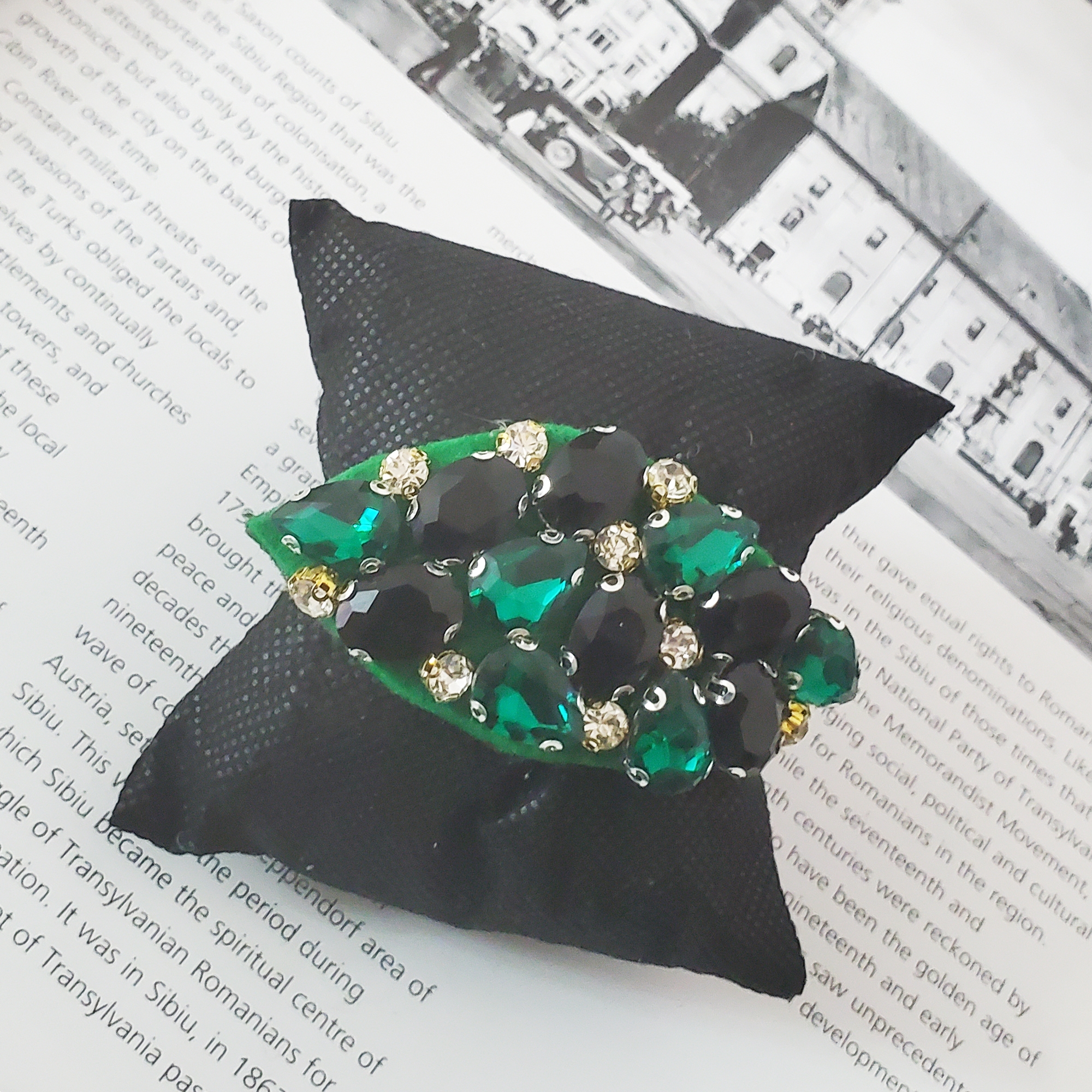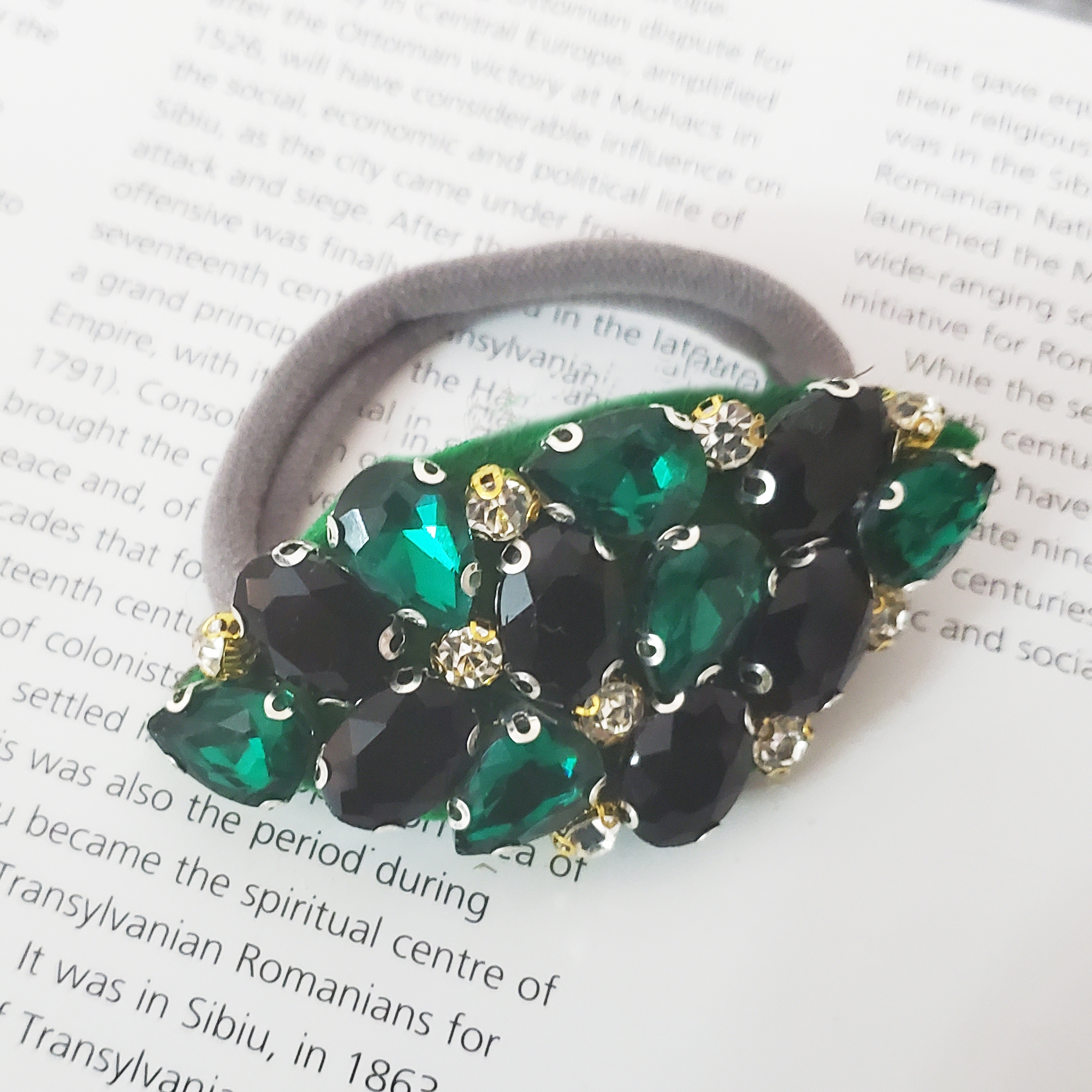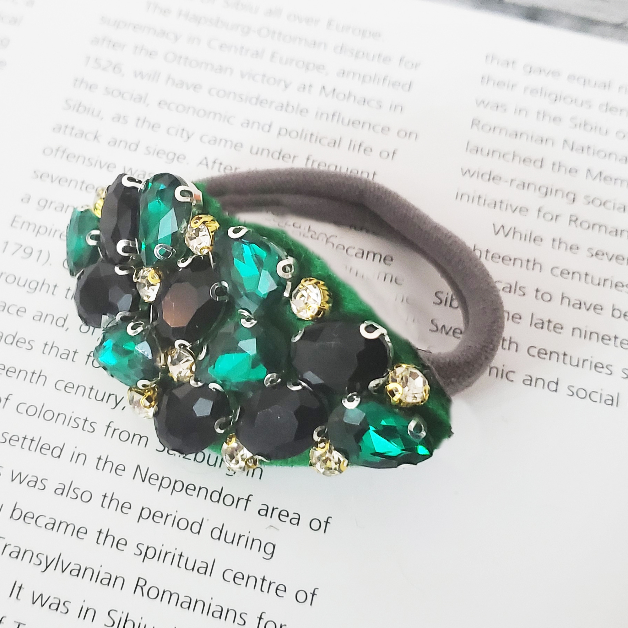 Pe elastic de par tip burete negru subtire este lucrata manual o aplicatie din cristale verzi, negre si albe. Cristalele sunt de sticla. Toate elementele sunt cusute, atat cristalele cat si aplicatia pe buretel.