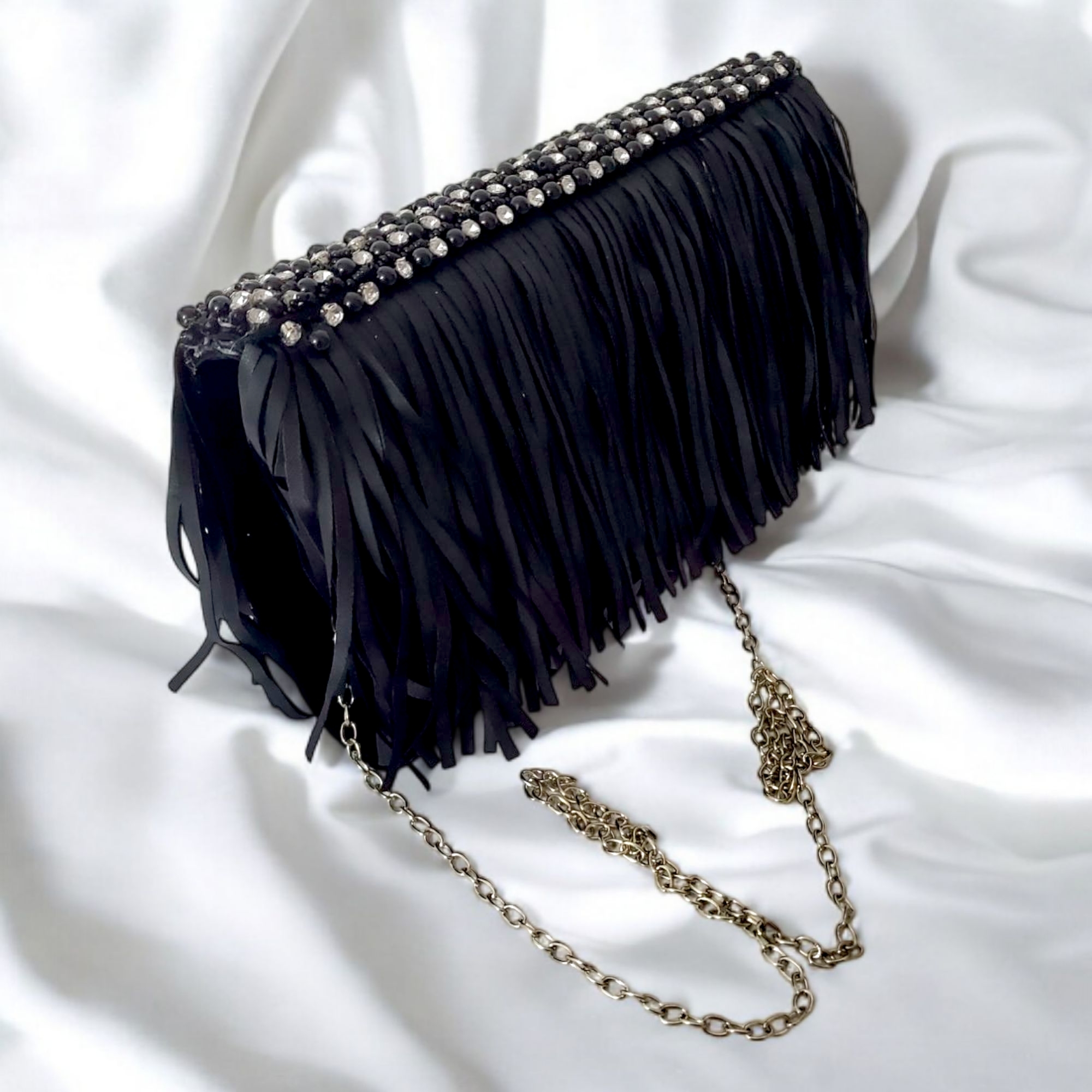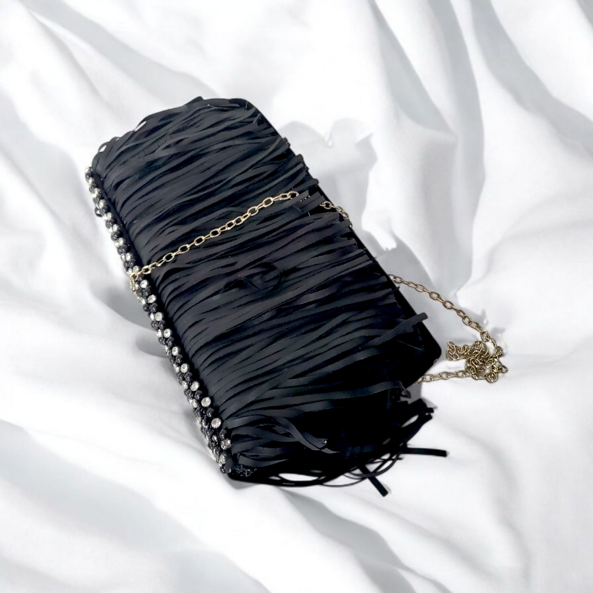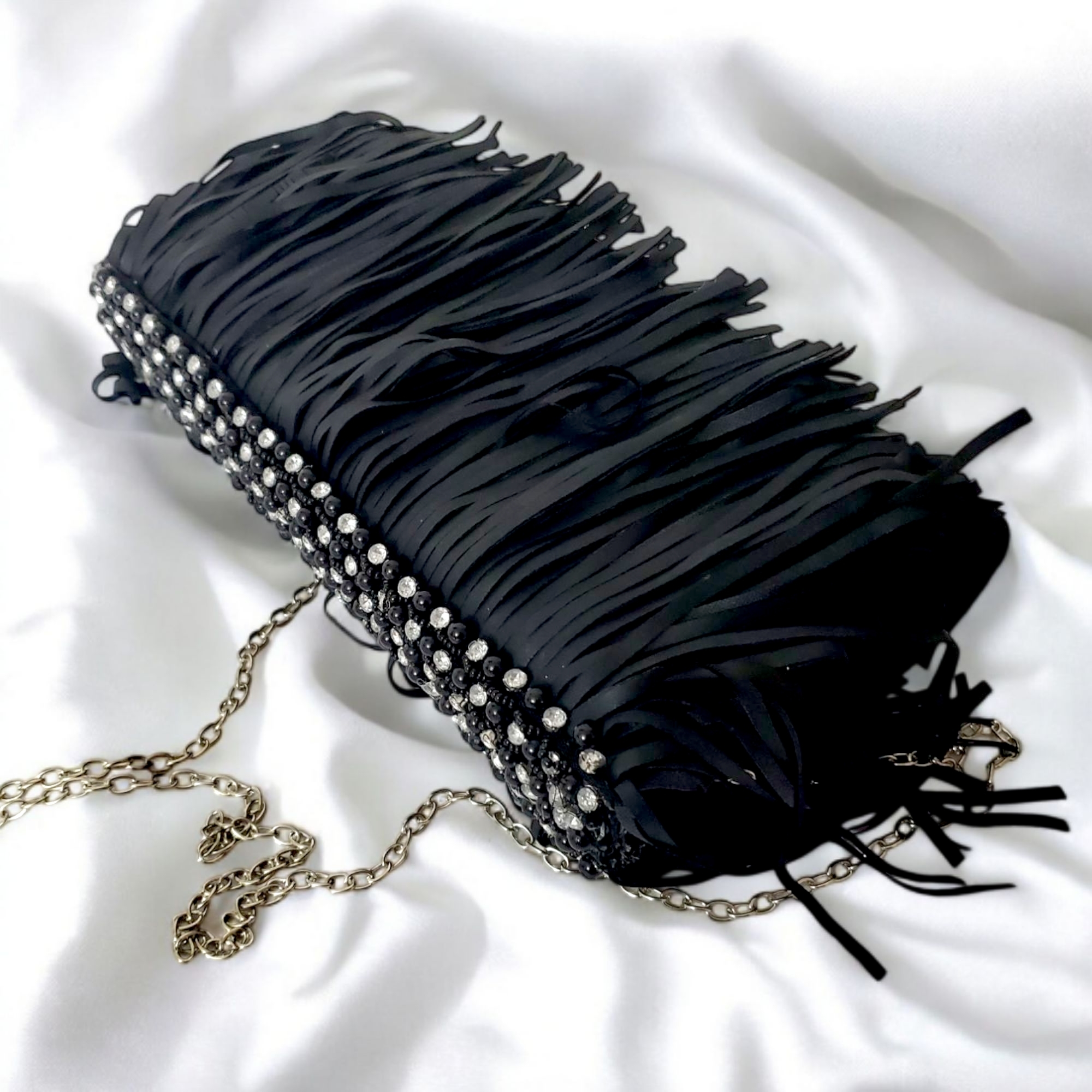 Geanta are design Fitze cu Bentite, unic si irepetabil. Este confectionata din catifea neagra. Peste catifea sunt aplicate franjuri pe ambele parti. Lungimea franjurilor este exact cat cea a gentii. Pe partea de sus sunt aplicate perle negre si strasuri albe.
