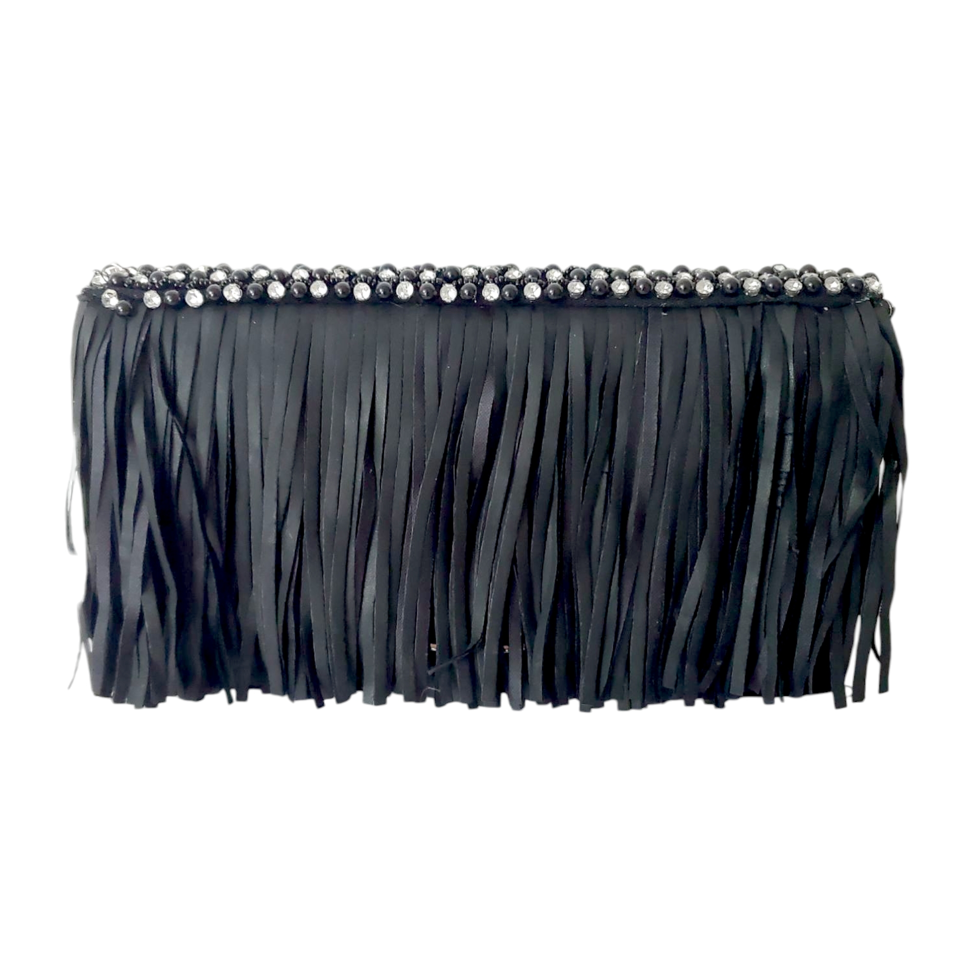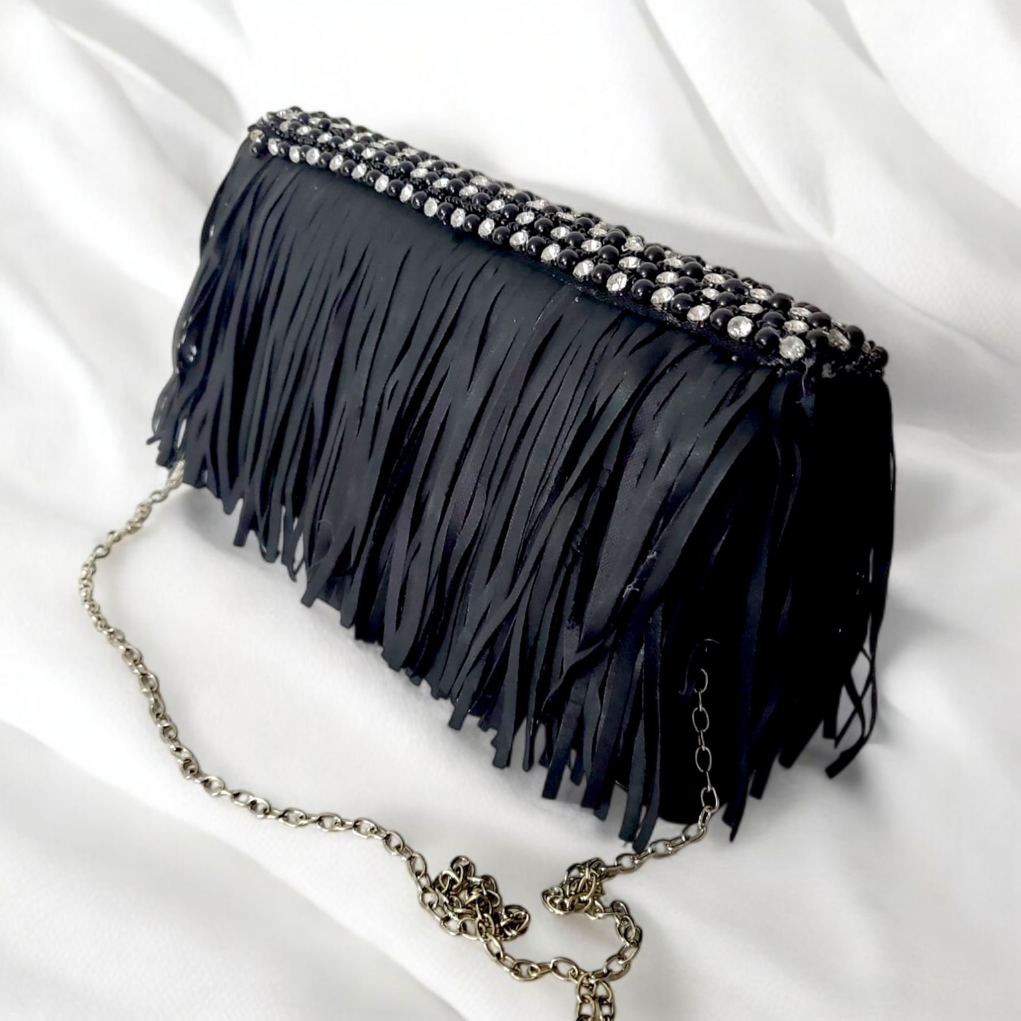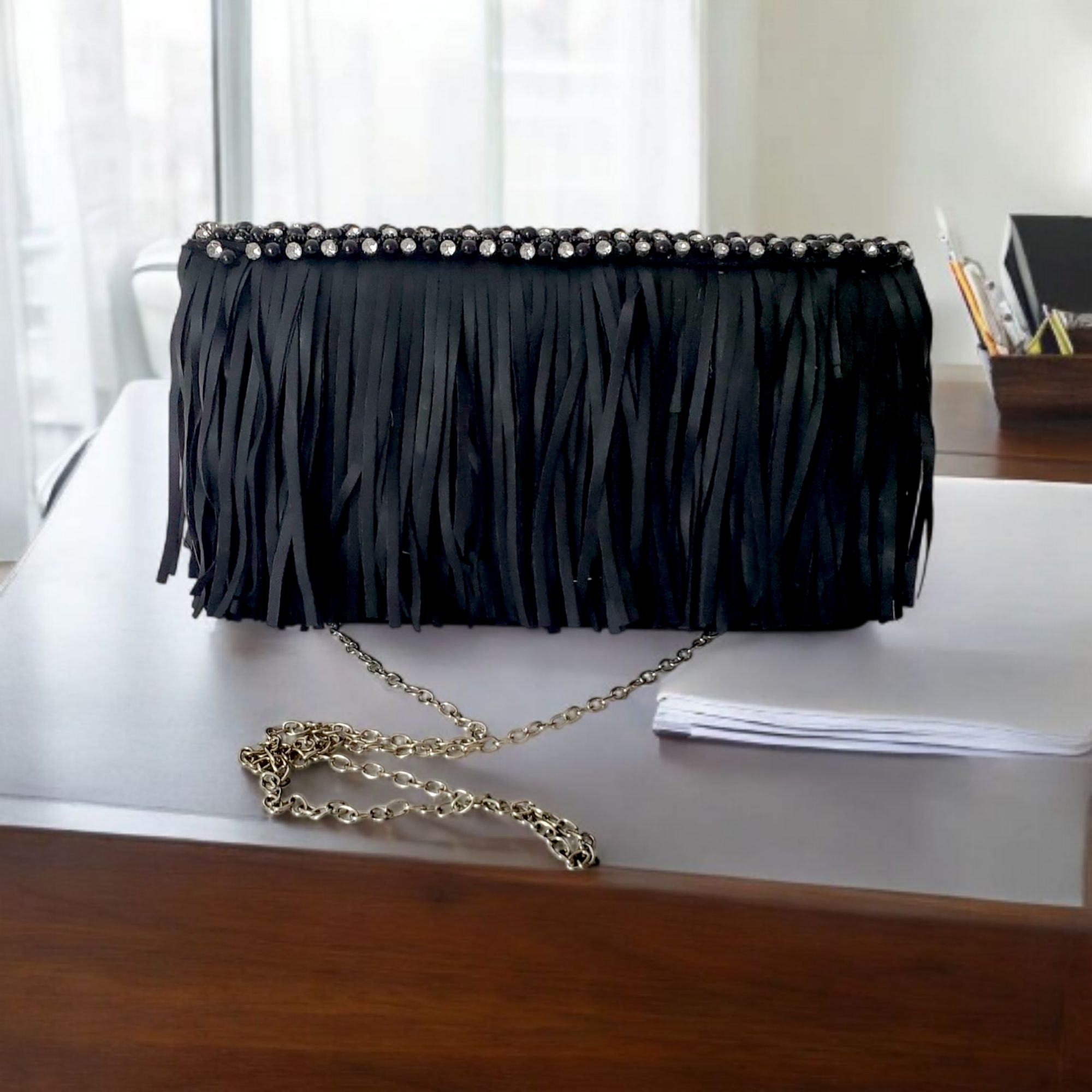 Geanta are design Fitze cu Bentite, unic si irepetabil. Este confectionata din catifea neagra. Peste catifea sunt aplicate franjuri pe ambele parti. Lungimea franjurilor este exact cat cea a gentii. Pe partea de sus sunt aplicate perle negre si strasuri albe.