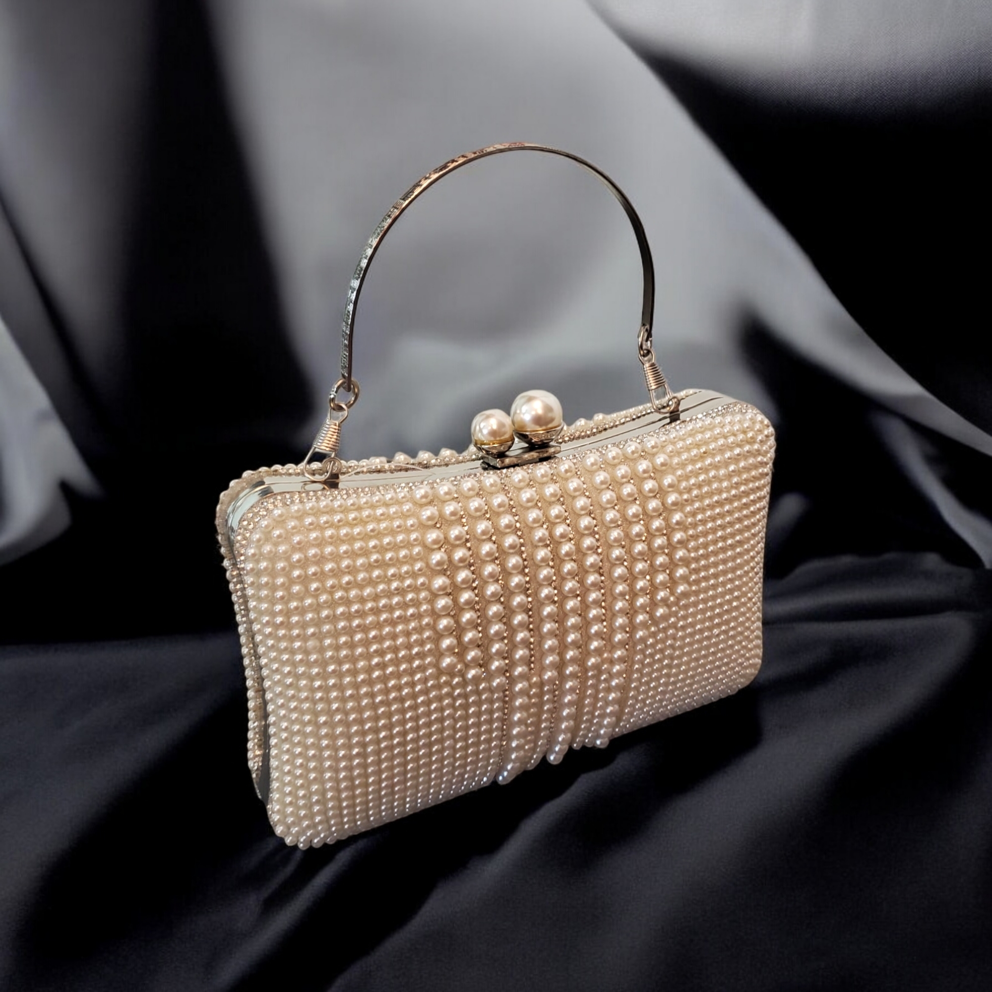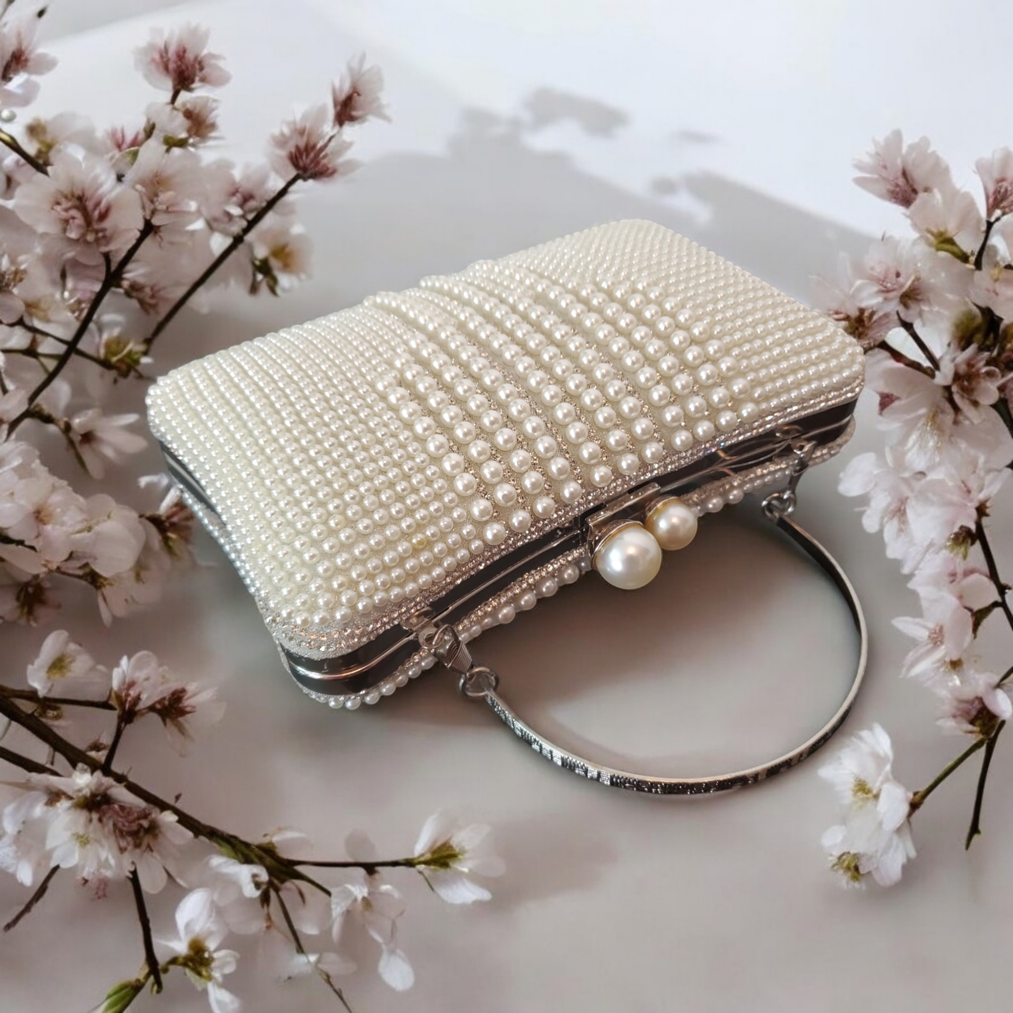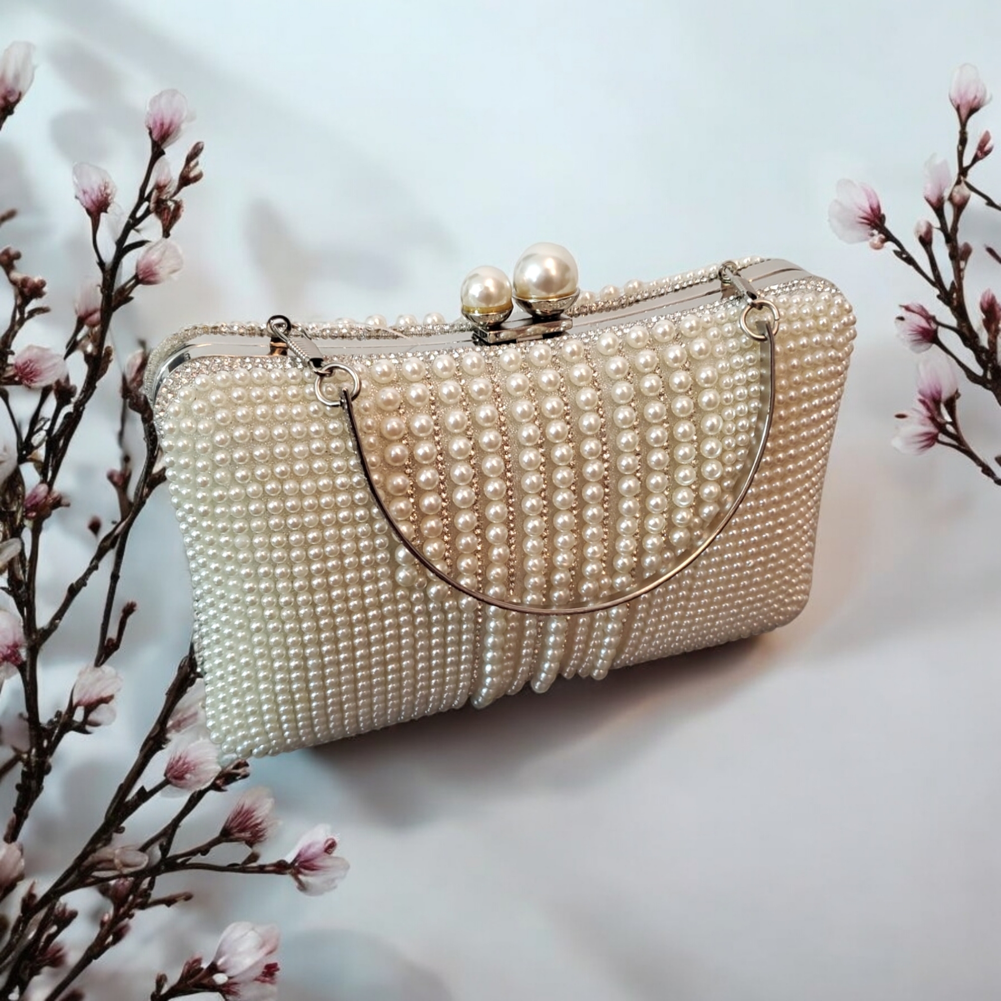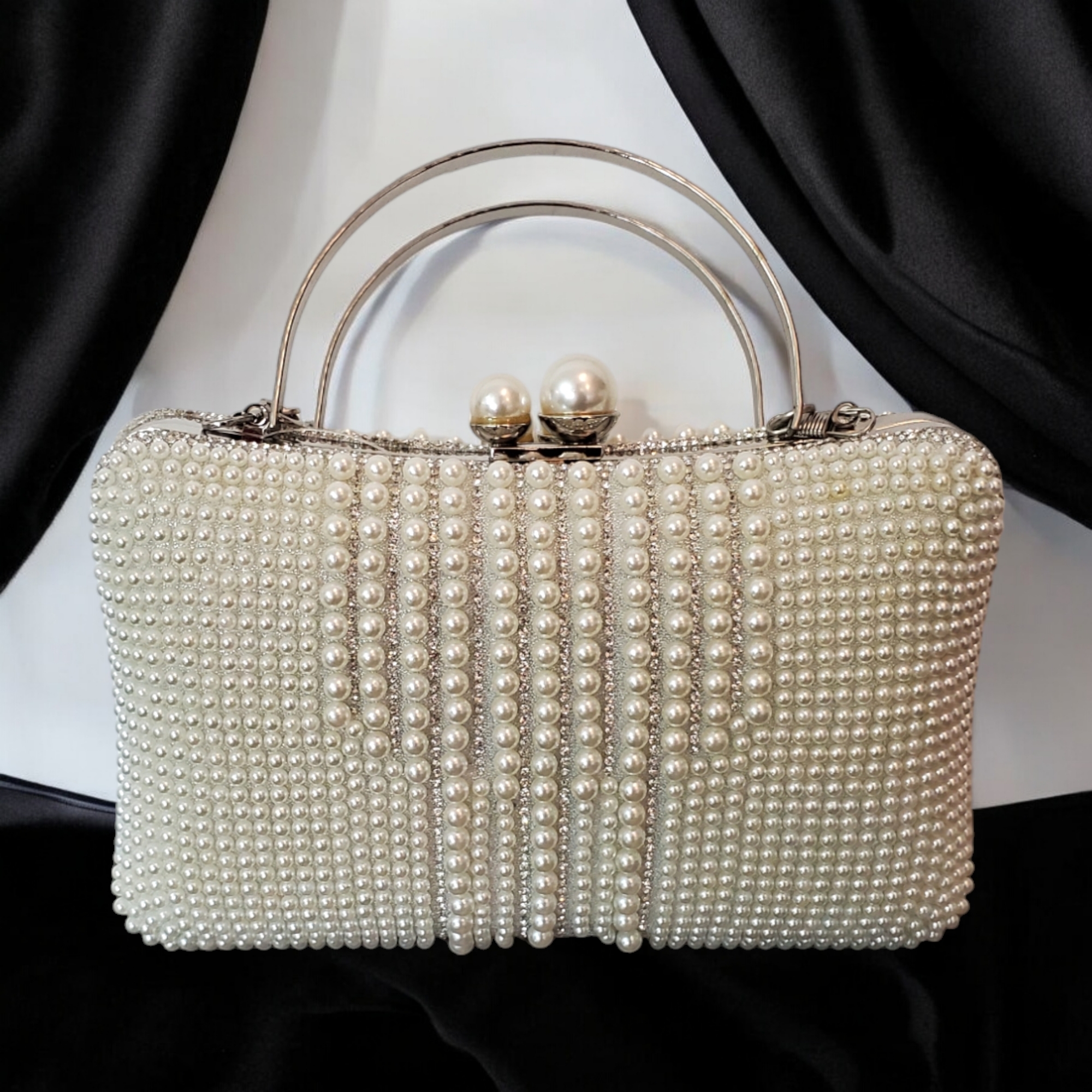 Geanta tip clutch cu margini metalice si inchidere metalica. Geanta are bareta de umar tip lant argintiu. Inchiderea se face printr-un buton mare in forma de diamant. Pe geanta sunt perle ivoire de diferite dimensiuni si strasuri albe. Geanta arata identic pe ambele parti.