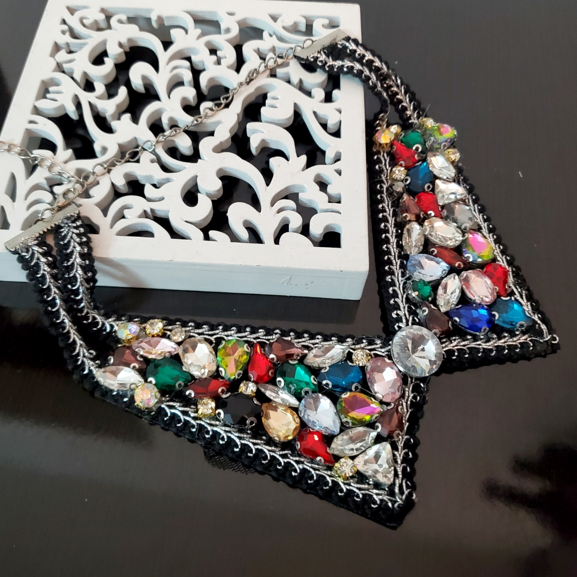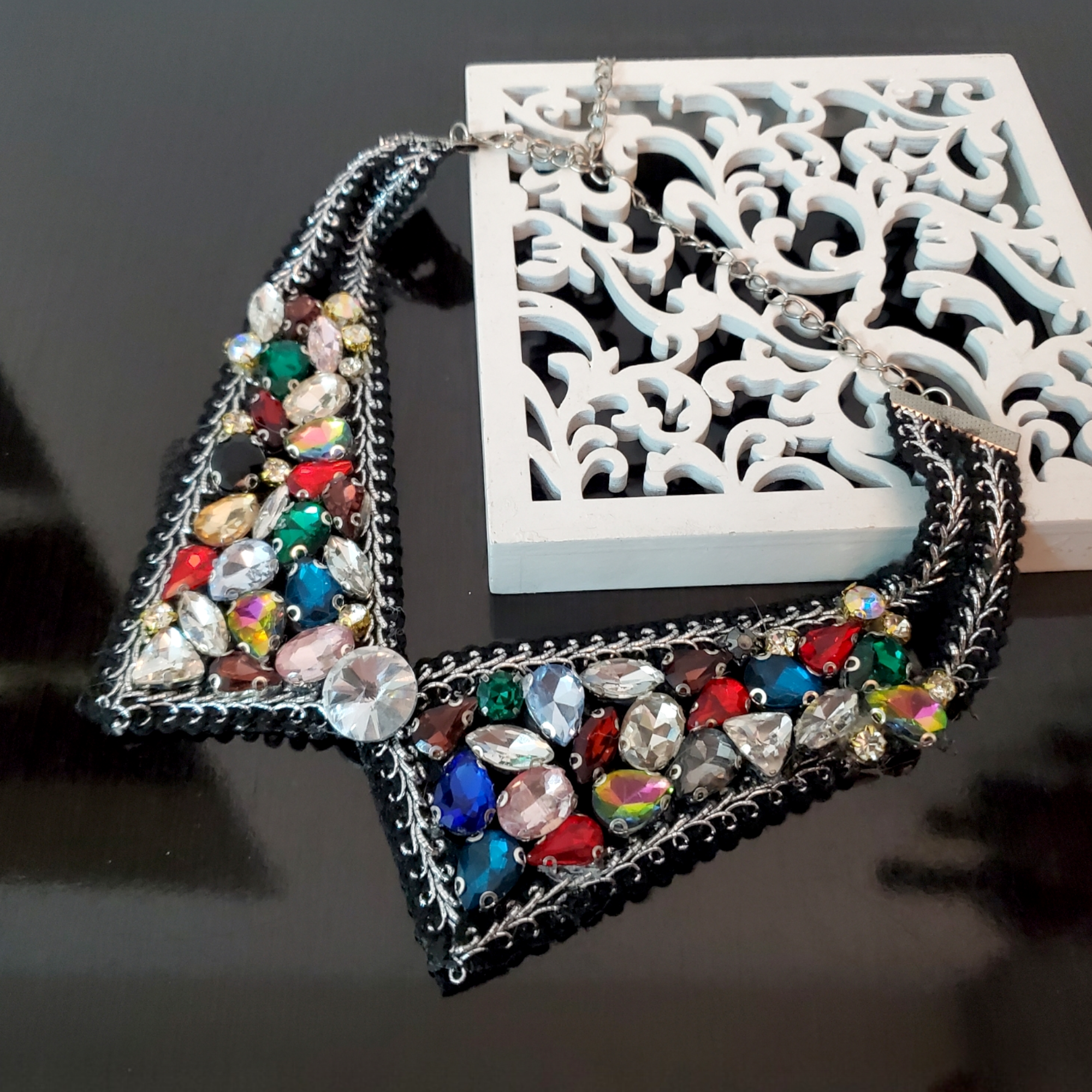 Guler detasabil cu design exclusiv, lucrat manual. Gulerul este confectionat pe baza textila neagra, cu margine din fir argintiu textil. Pe guler sunt aplicate cristale de sticla multicolore, pe toata suprafata. Se inchide la spate cu lant argintiu si cheita, pentru reglarea marimii.