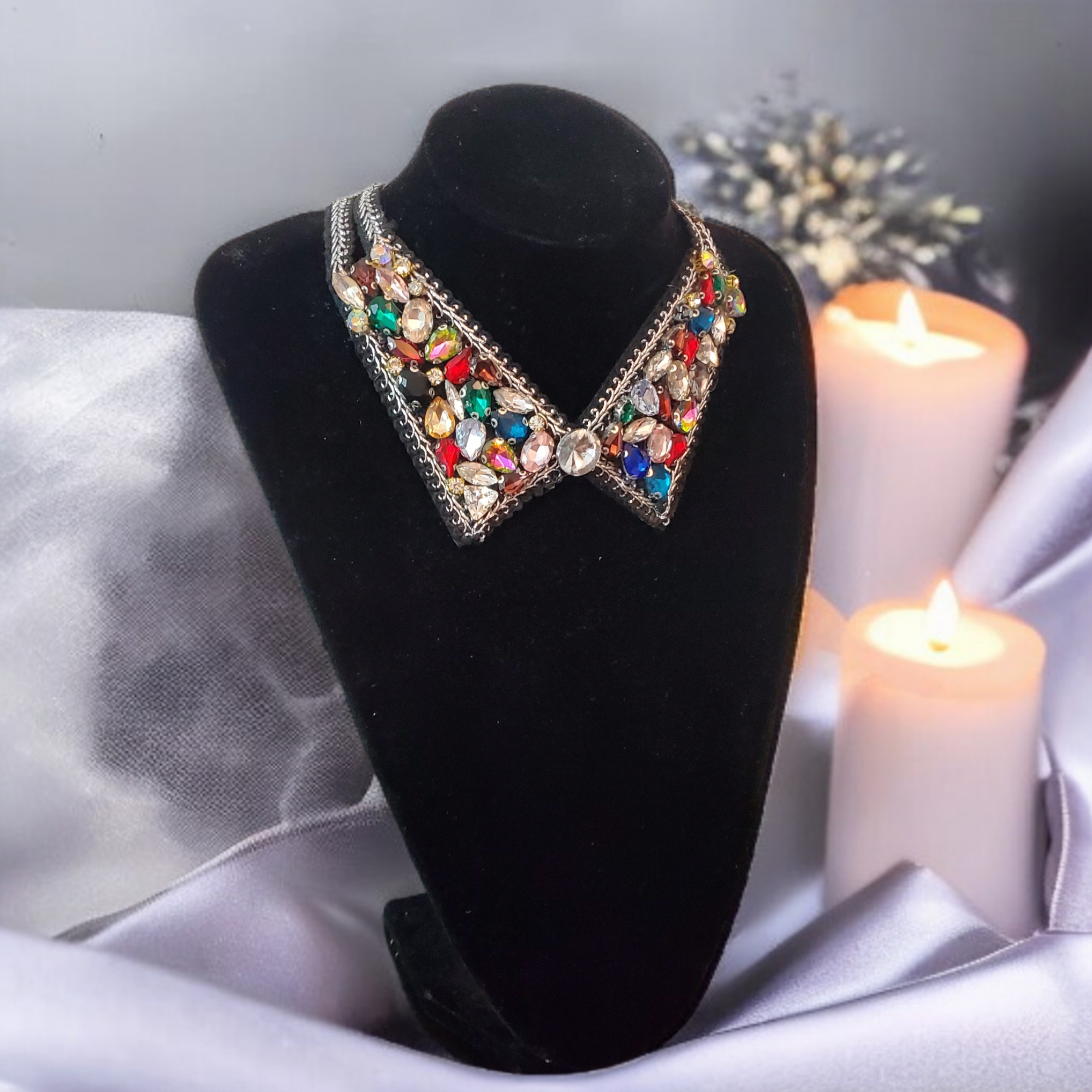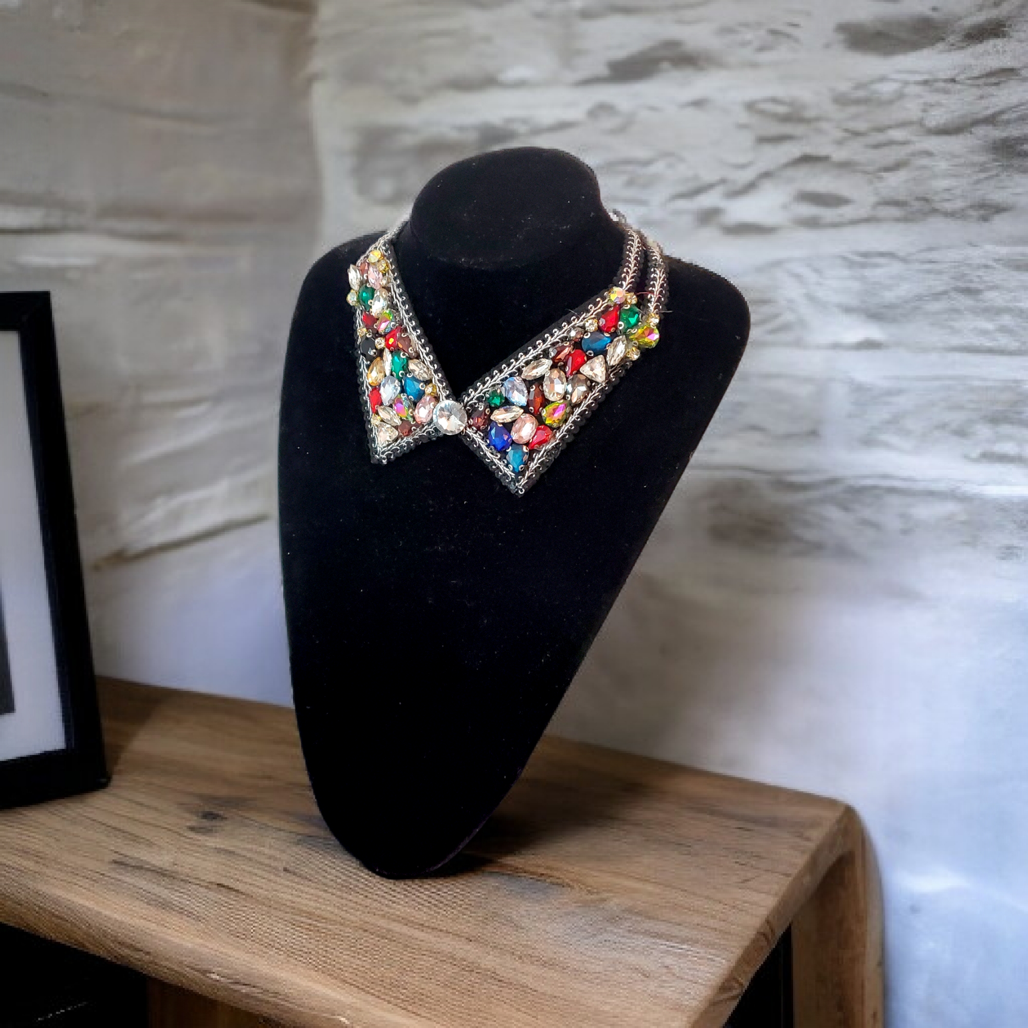 Colier tip guler detasabil cu cristale de sticla multicolore, pentru a putea fi asortat multor tinute. Se poate purta atat peste bluze pentru a inlocui un guler, cat si cu rochite decoltate.