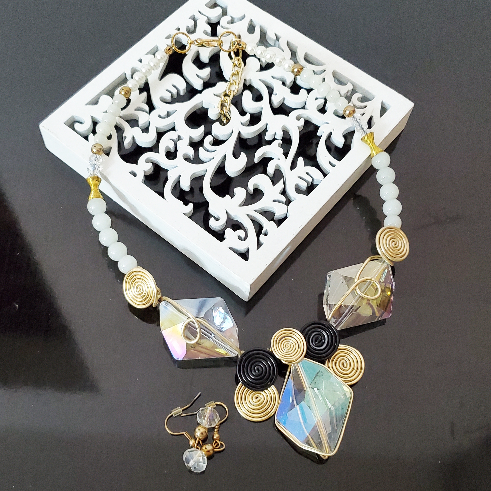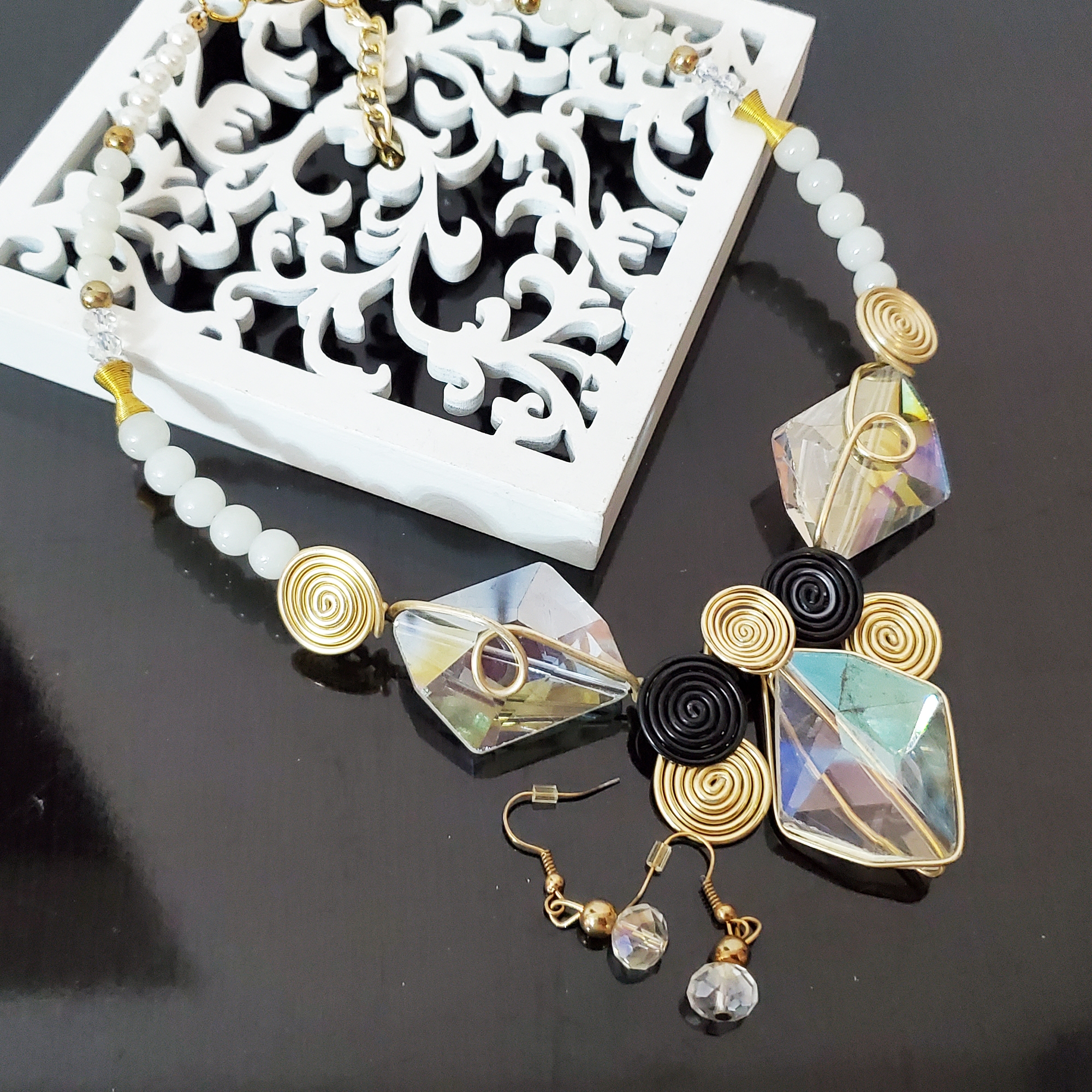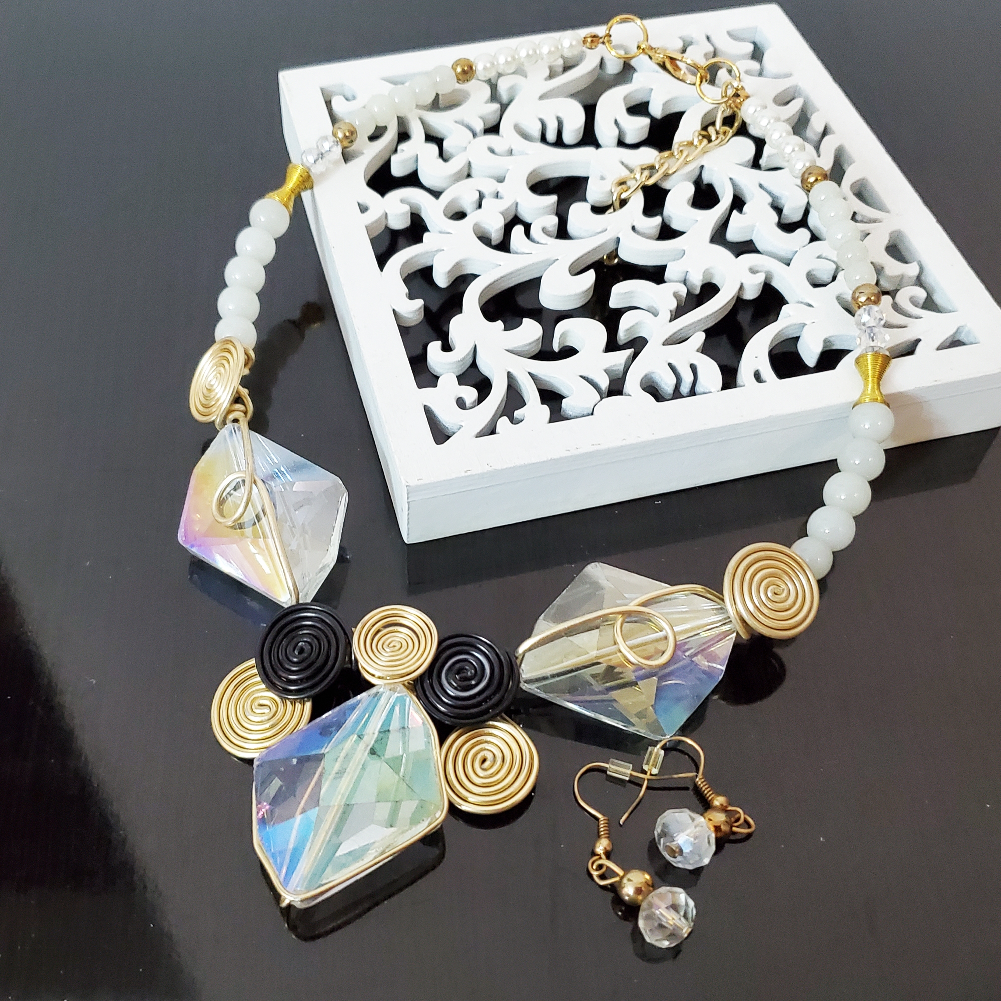 Set colier si cercei cu cristale de sticla ce isi schimba culoarea in functie de lumina. Modelul este in forma de A